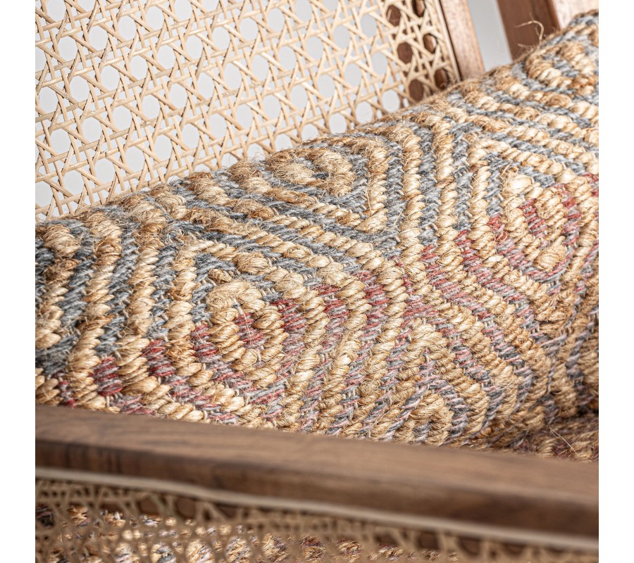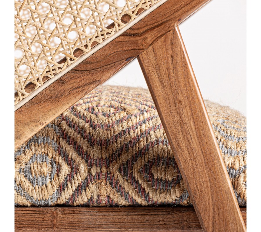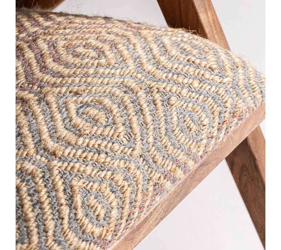 Medovú hnedú farbu dreva dopĺňa naturálna kresba letokruhov, ktorá podčiarkuje prírodný charakter materiálu. Výborne s nimi korešponduje výplet vypĺňajúci chrbtovú opierku z jutového vlákna. Má naturálnu, svetlú béžovú farbu a elegantný viedenský vzor. Sedadlo je čalúnené a rovnako ako nízky opierkový vankúš pokryté poťahom z bavlny. Poťah má pásy v tlmených odtieňoch modrej a červenej s výrazným geometrickým tkaným vzorom v béžovej farbe.