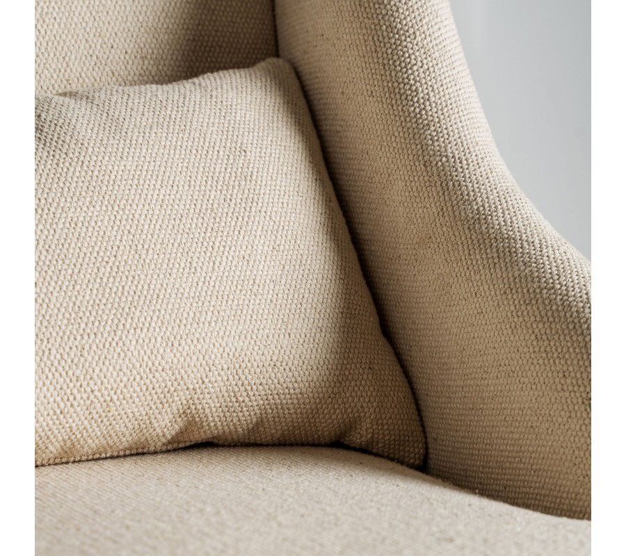 Poťah v krémovej farbe s jemnou štruktúrou a vzorom podčiarkuje elegantný vzhľad kresla. Vybíjané nity na spodnom okraji sedadla pridávajú exkluzívny detail a dotvárajú luxusný dizajn. Prešívané boky operadla zvýrazňujú remeselné spracovanie, zatiaľ čo odnímateľný vankúš zaisťuje vyšší komfort pri sedení. Kreslo disponuje dvomi typmi poťahov.