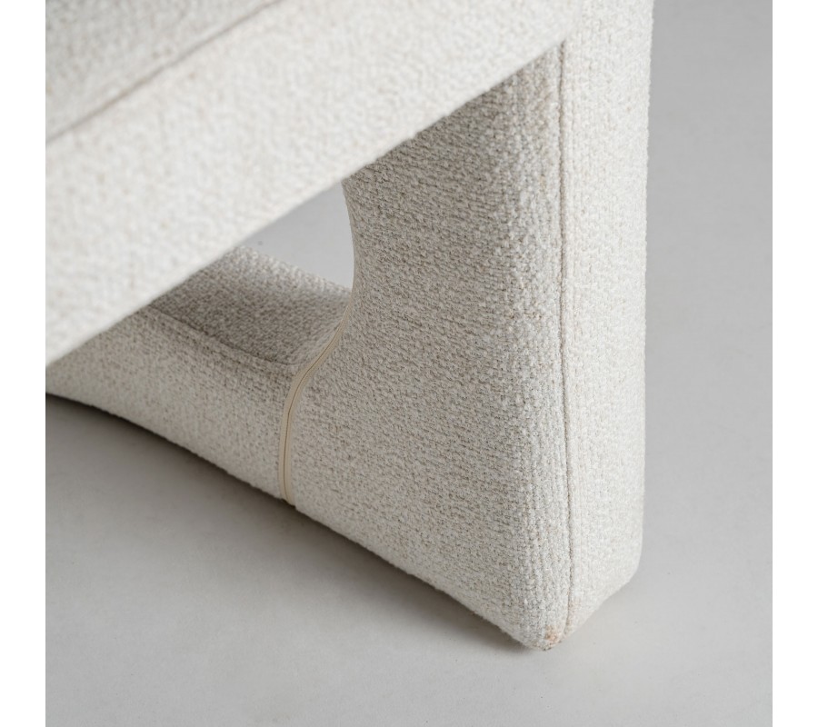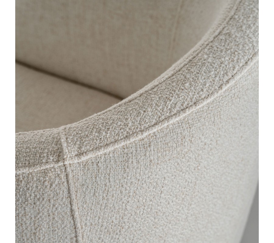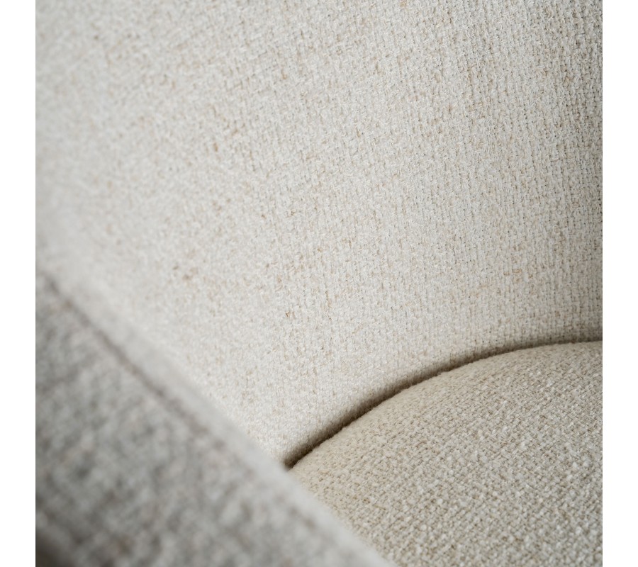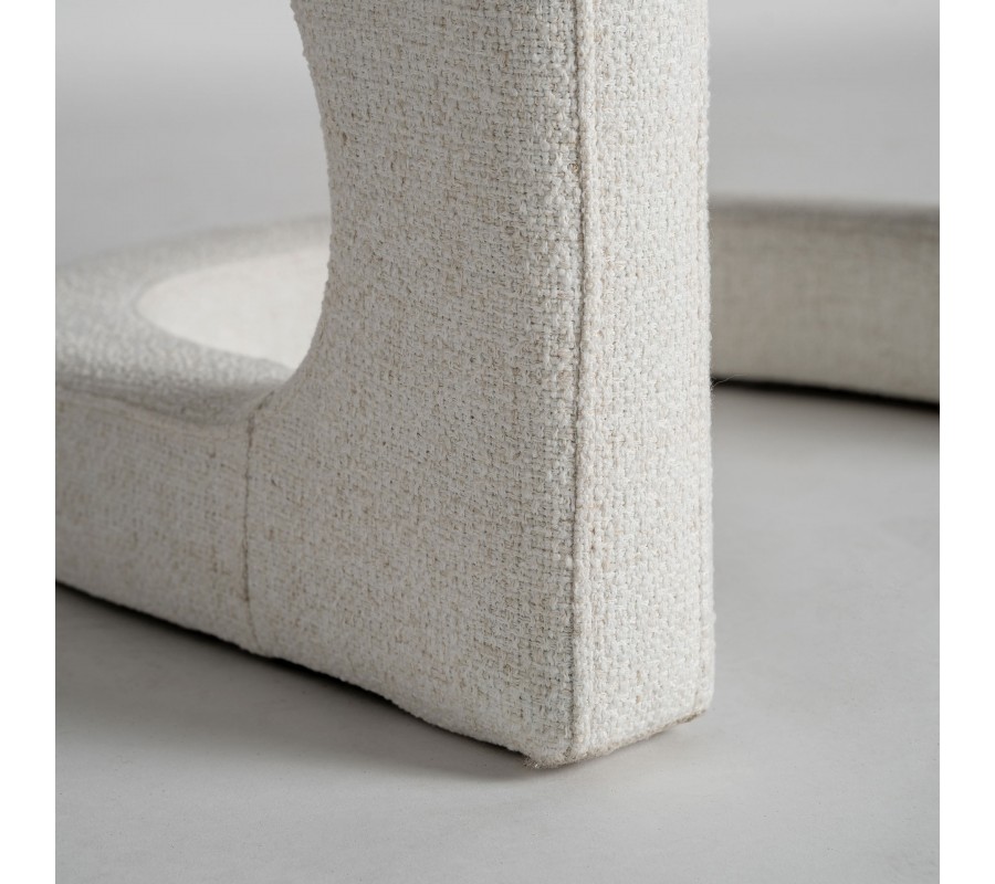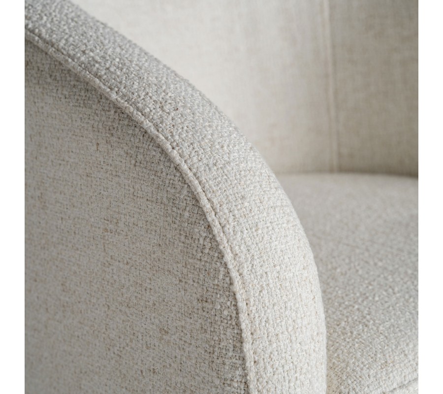 Celé kreslo je potiahnuté štruktúrovanou textíliou v bielo sivej farbe, ktorá dodáva povrchu hĺbku a vizuálnu zaujímavosť. Jemné prešívanie podčiarkuje elegantný dizajn a zdôrazňuje precízne spracovanie.
