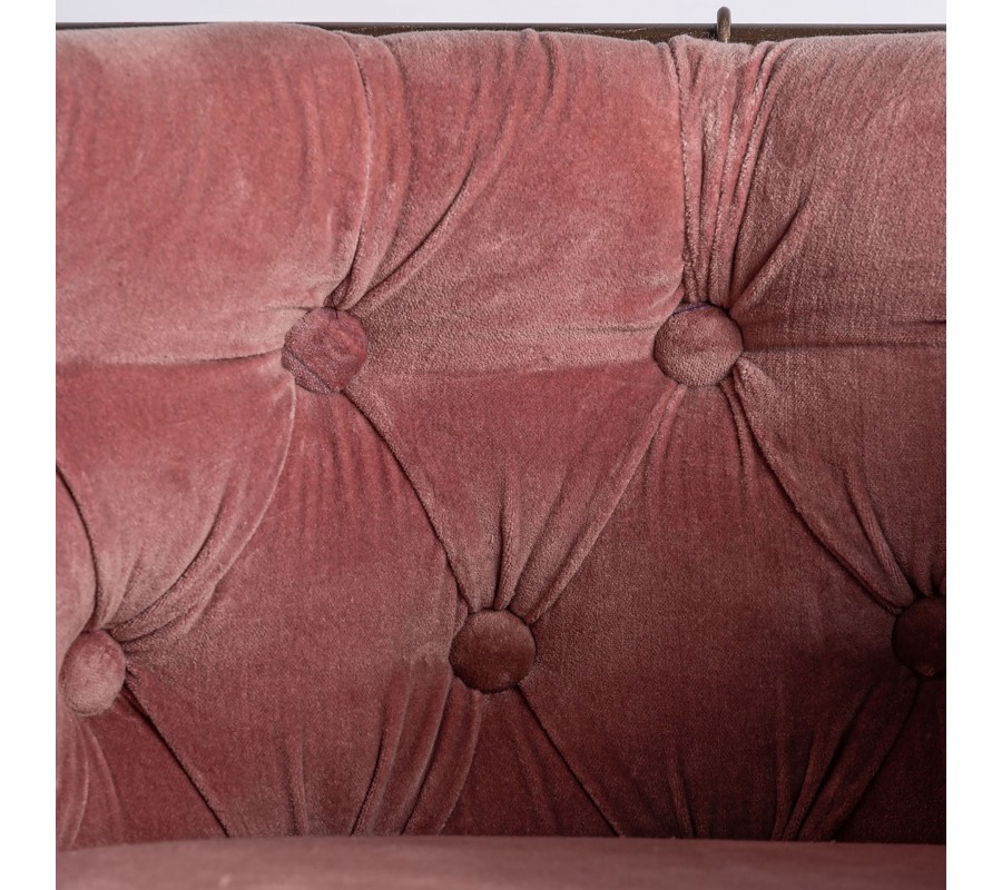 Luxusné chesterfield kreslo Kazer v štýle shabby chic zaujme svojím elegantným zaobleným tvarom a romantickým vzhľadom. Je čalúnené zamatovým poťahom z bavlny v jemnej ružovej farbe, ktorý dodáva kreslu hebkosť a luxusný vizuálny dojem. Charakteristické hlboké prešívanie v štýle chesterfield vytvára pravidelný vzor s vtiahnutými bodmi a decentnými záhybmi, čím zvýrazňuje bohatú textúru látky.
