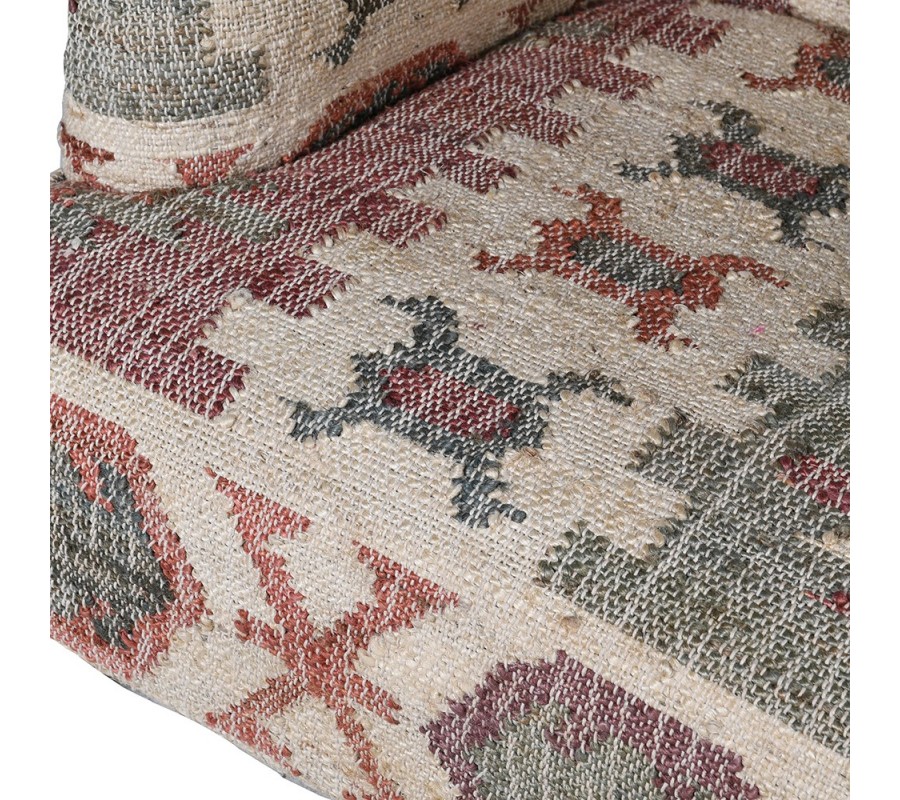 Kreslo Korian vnesie do interiéru osobitý charakter v duchu vintage estetiky. Jeho plná konštrukcia s mierne nakloneným operadlom, širším sedadlom a masívnymi opierkami na ruky poskytuje pohodlné sedenie aj vizuálnu stabilitu. Zaujme najmä poťahom z pevnej jutoviny, ktorú zdobí etno geometrický vzor inšpirovaný tradičnými kilim kobercami. Motívy v odtieňoch pieskovej, vínovej, olivovej a tlmenozelenej vytvárajú harmonickú kompozíciu s výraznou textúrou.