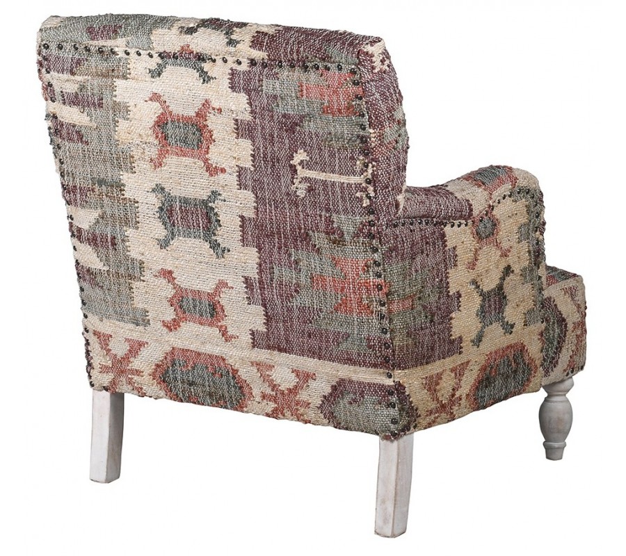 Na hranách operadla a po bokoch sedacej časti sa nachádzajú kovové dekoračné nity, ktoré pôsobia remeselne a zároveň zvýrazňujú okraje čalúnenia. Kreslo stojí na štyroch nohách z masívneho dreva, predné nožičky sú sústružené a bielené, čím nadväzujú na vidiecky štýl, zatiaľ čo zadné sú rovné a jednoduchšie, vďaka čomu pôsobí nábytok vyvážene a stabilne.