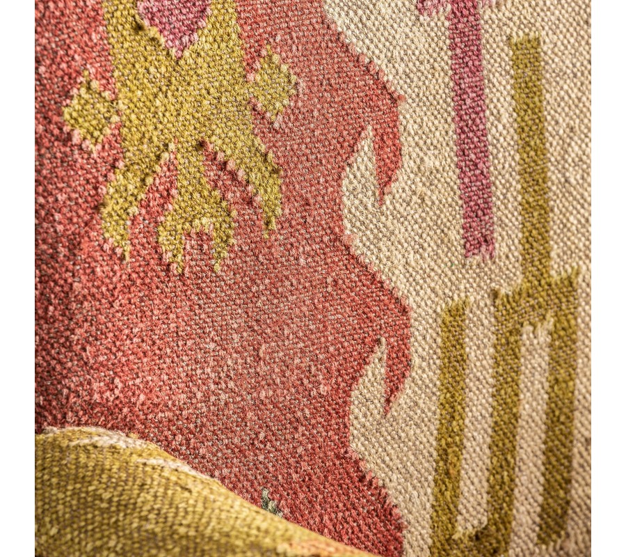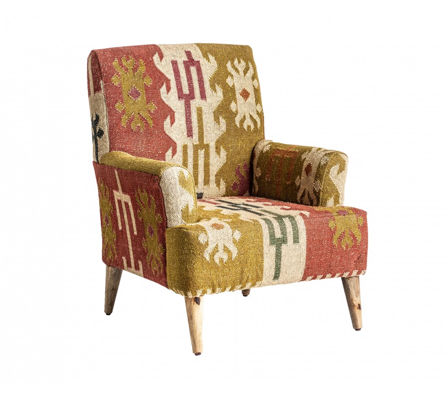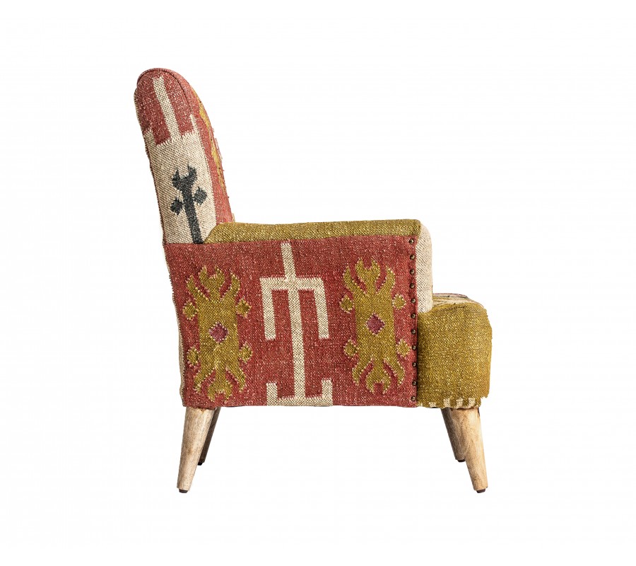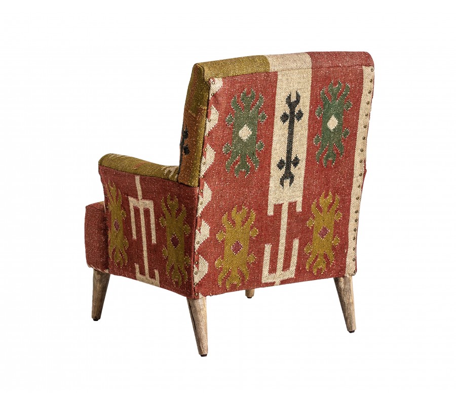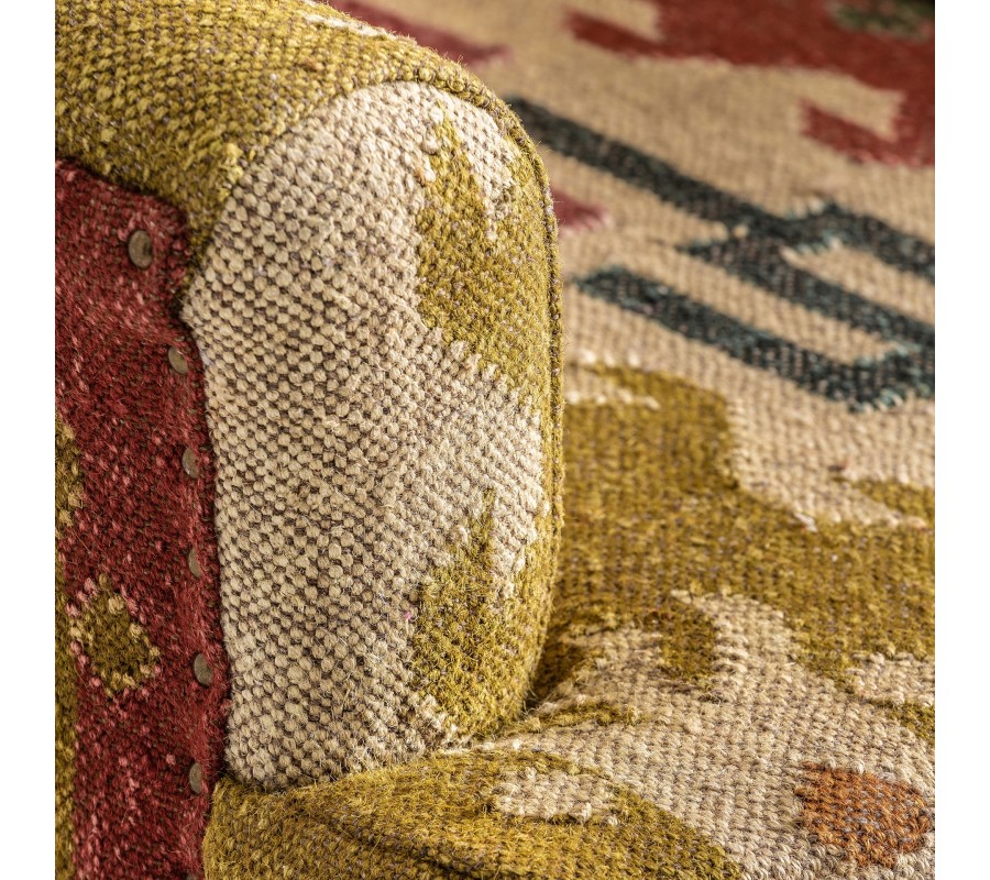 Luxusné etno orientálne kreslo Reria okamžite upúta svojím výrazným vintage dizajnom, ktorý prepája tradičné ornamenty s modernou pohodlnosťou. Je čalúnené jutovým poťahom s pestrým vzorovaním v teplých tónoch červenej, žltej a bielej, ktoré evokujú ručne tkané etnické textílie. Výrazné geometrické a symbolické motívy dodávajú kreslu jedinečný charakter a umelecký dojem, čím ho povyšujú na dekoračný solitér. Vzor pripomína ručne tkané orientálne kilimové koberce.
