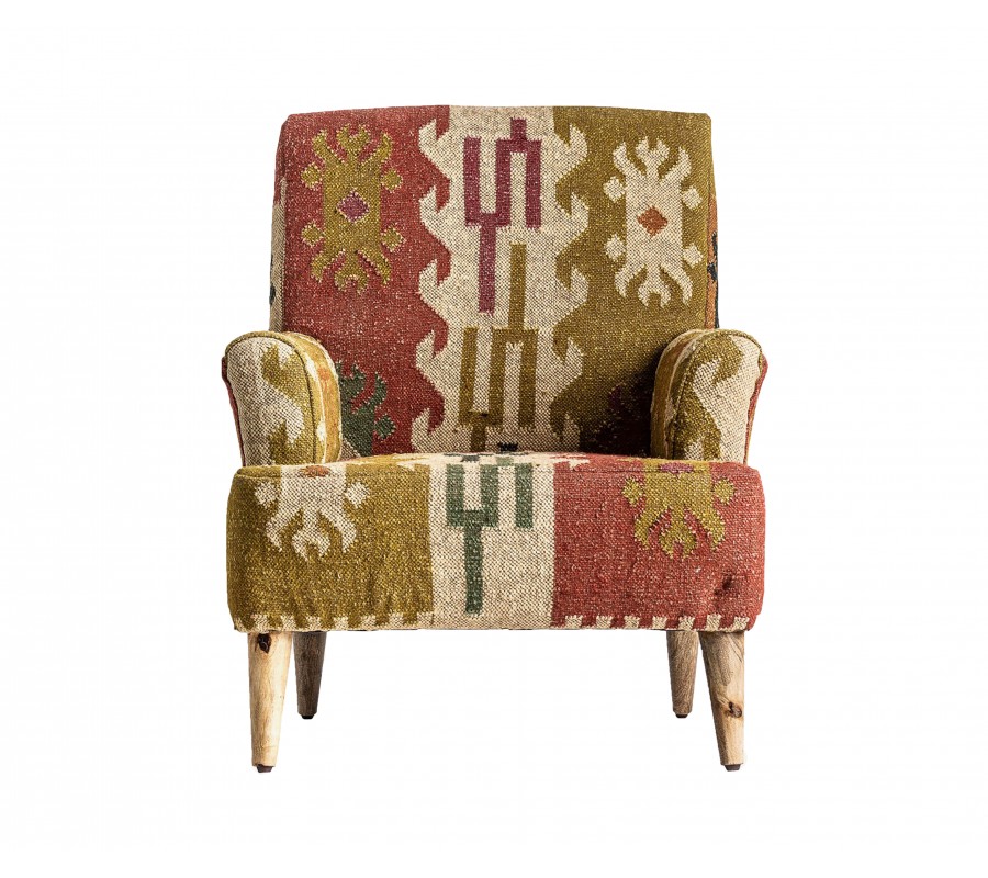Kreslo má hranatý tvar, vysoké operadlo a opierky, ktoré poskytujú pohodlné sedenie aj dobrú oporu. Štíhle nožičky sú vyrobené z masívneho mangového dreva v hnedom odtieni, pričom ich jednoduchý a rovný tvar kontrastuje s bohatým dekorom poťahu, čím vytvára harmonickú vizuálnu rovnováhu.