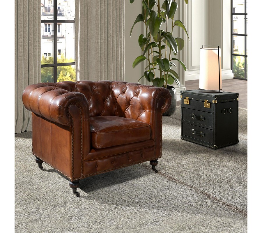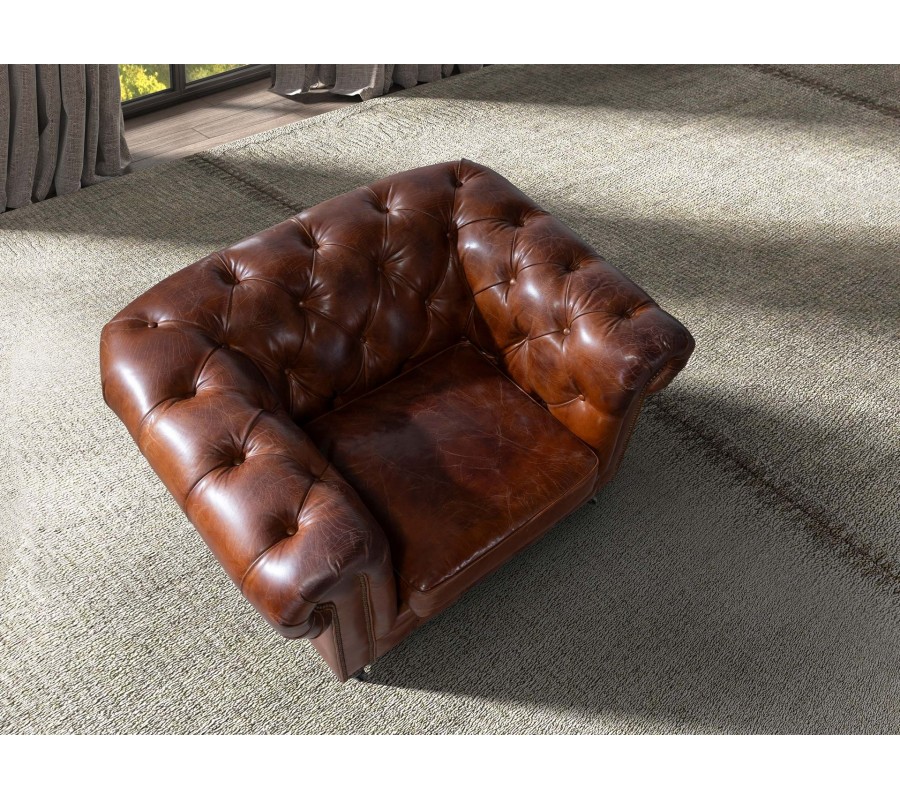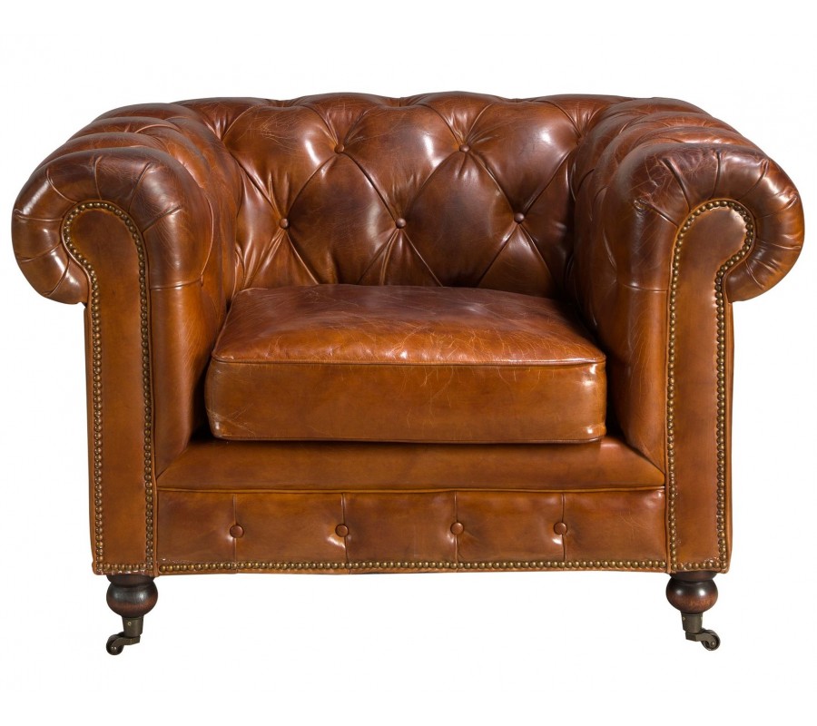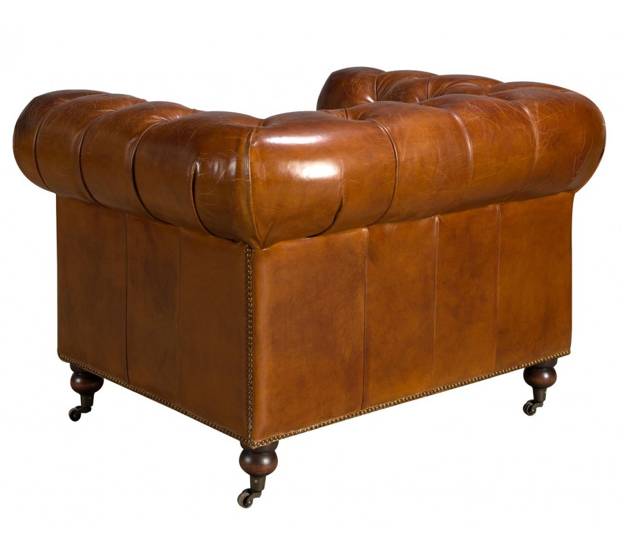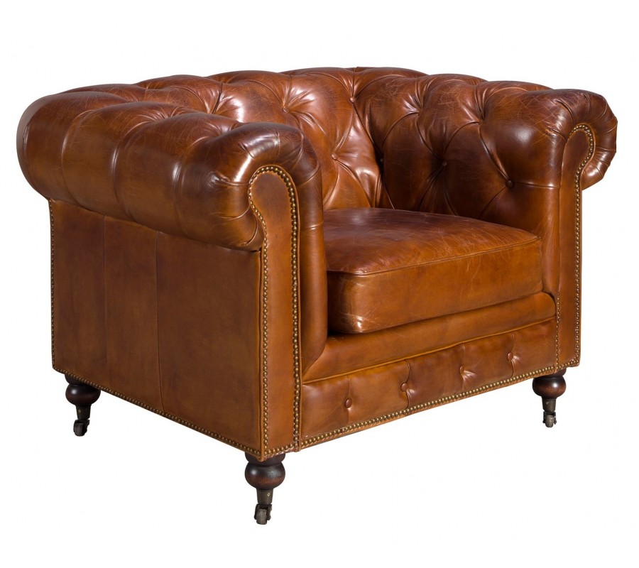 Luxusné chesterfield kreslo Hastings s poťahom z pravej kože v koňakovom hnedom odtieni s dizajnovými kolieskami 120 cm