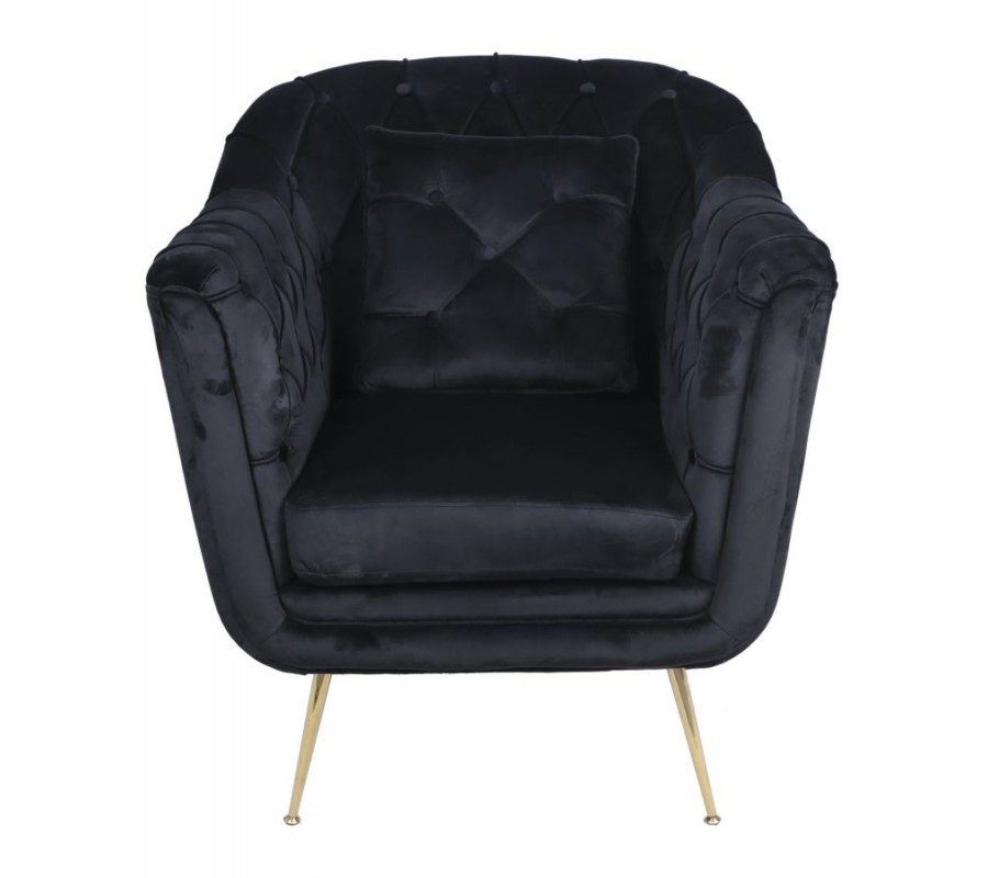 Luxusné art deco čierne čalúnené kreslo Melisa so zamatovým prešívaným poťahom a zlatými vysokými kovovými nožičkami 91 cm