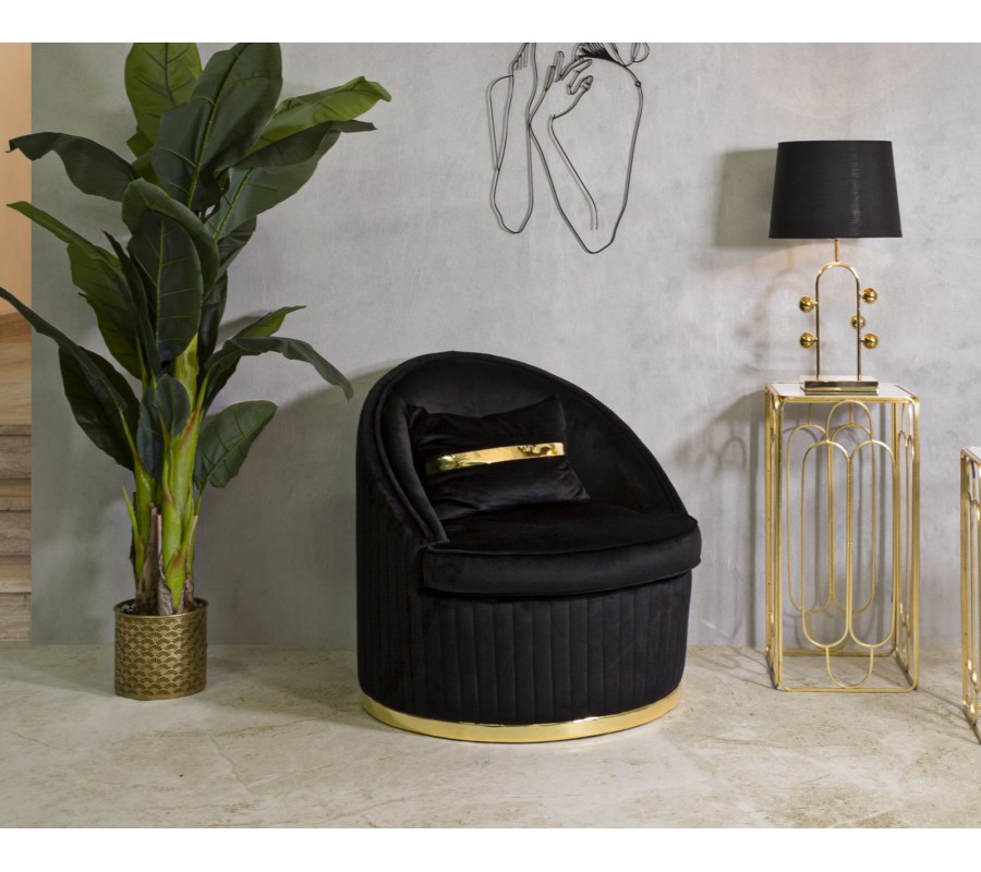 Kreslo Bellaria v čiernej zamatovej úprave je dokonalým stelesnením luxusu v štýle glamour a art deco. Jeho okrúhly tvar a bohaté čalúnenie pôsobia noblesne, zatiaľ čo zlaté detaily dodávajú elegantný lesk a punc výnimočnosti. Sedacia časť je komfortne čalúnená a mierne presahuje konštrukciu, čo zvyšuje pocit pohodlia a estetiky.
