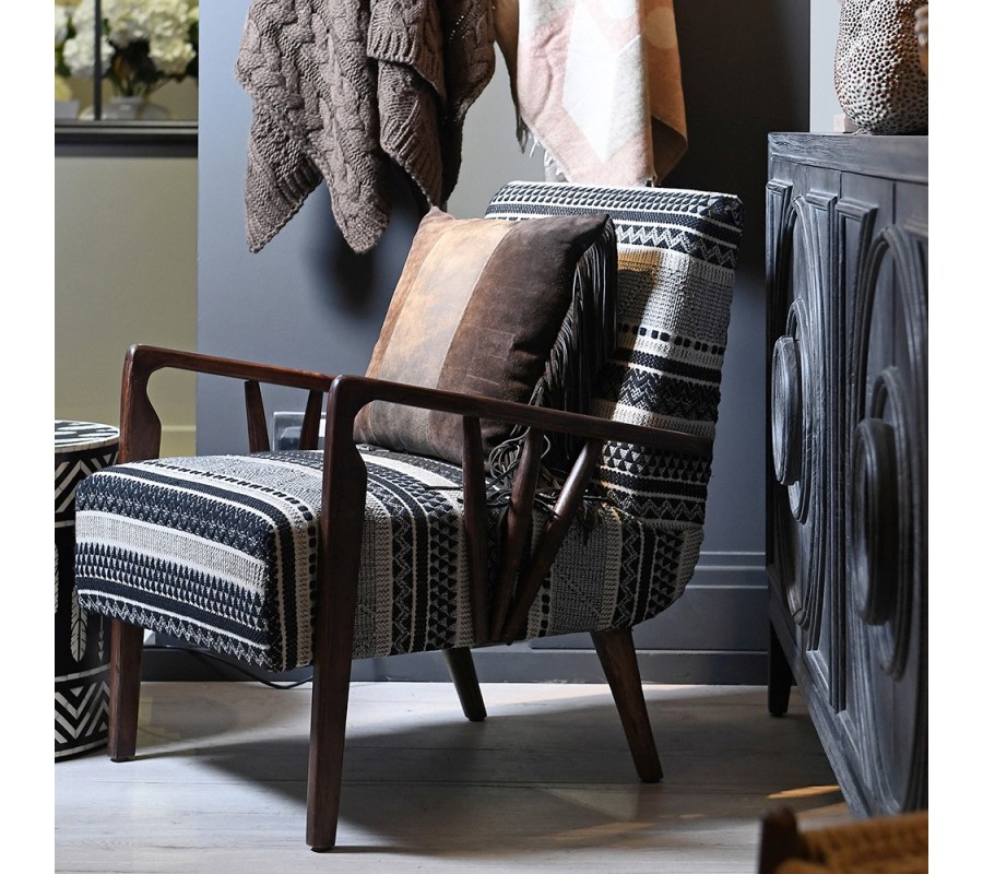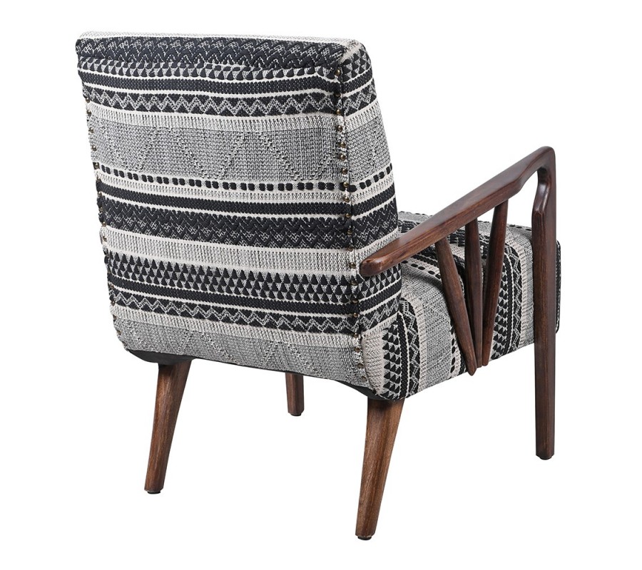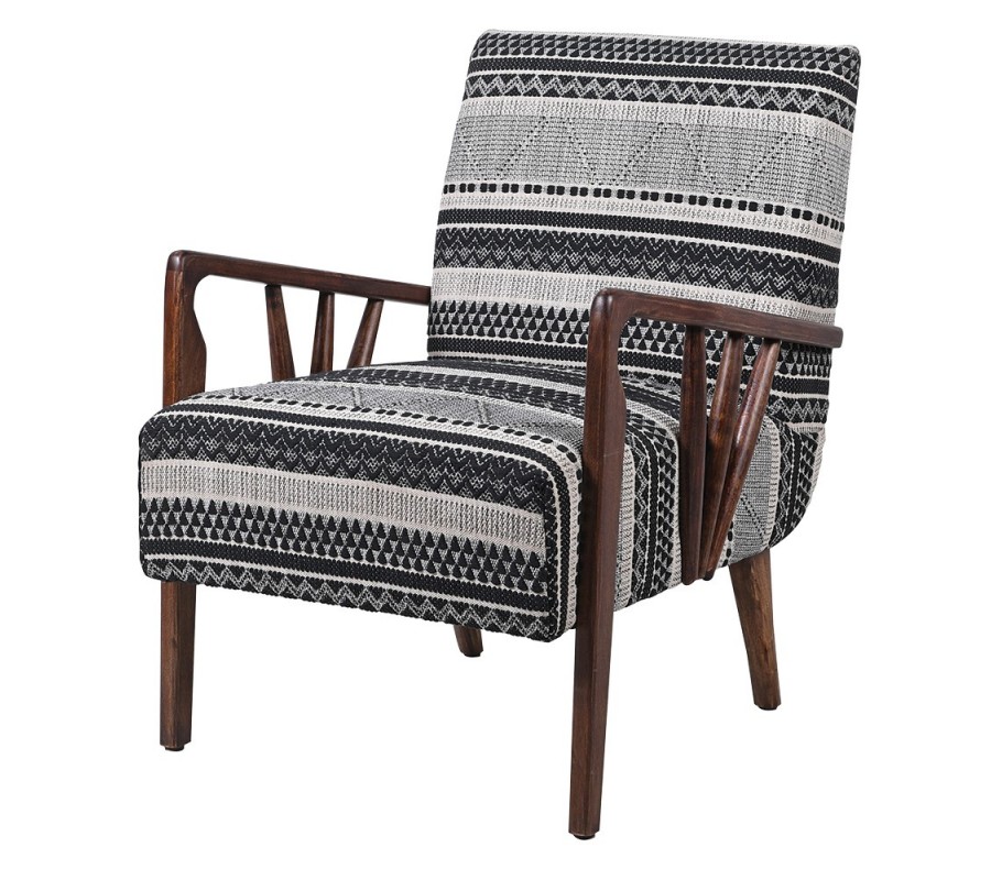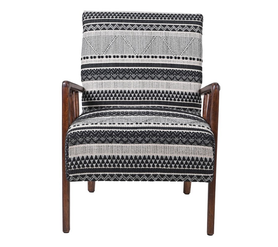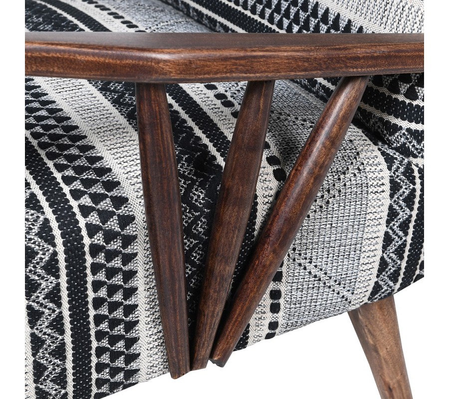 Luxusné retro kreslo Marwe s čiernobielym vzorovaným poťahom a tmavými hnedými drevenými opierkami 83 cm
