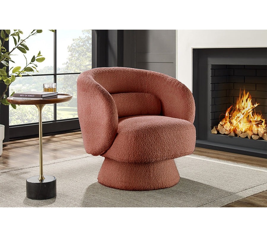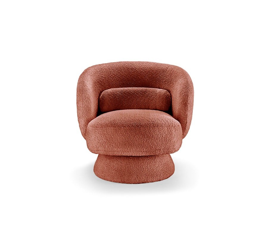 Štýlové art deco okrúhle otočné kreslo Elian v terakotovej oranžovej farbe s bouclé poťahom s retro nádychom 76 cm