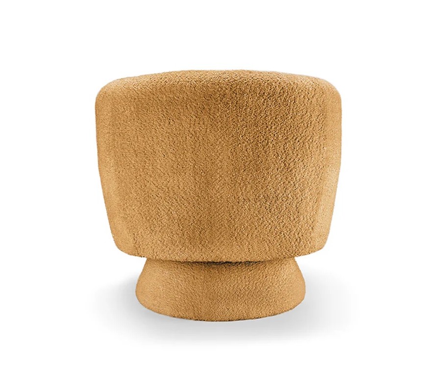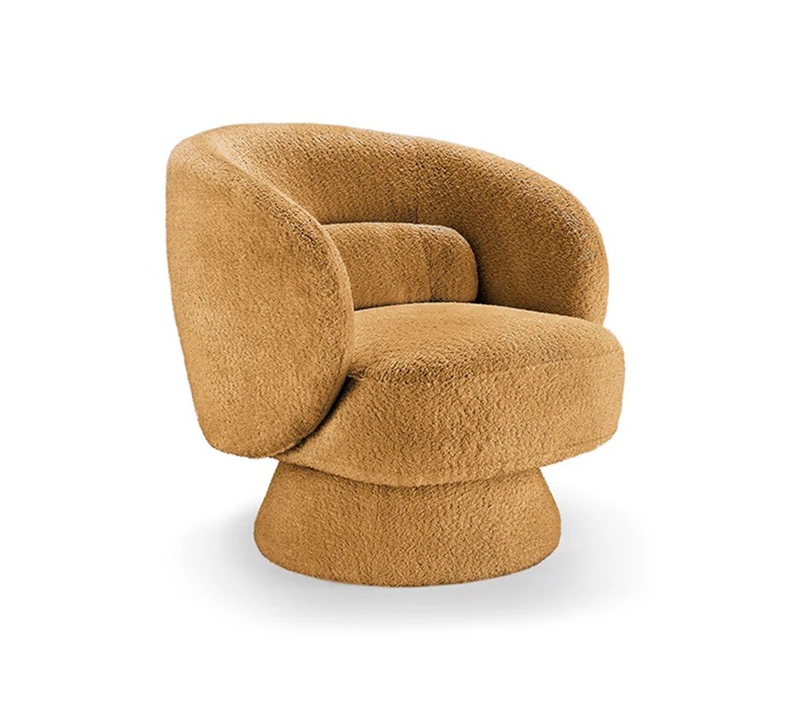 Kreslo Elian je výrazným zástupcom moderného art deco štýlu, ktoré zaujme svojou sochárskou siluetou a pohodlným tvarom. Jeho zaoblené operadlo v tvare písmena U plynulo prechádza do bočných opierok, čím vytvára ochranné objatie okolo sedacej časti. Celé kreslo je čalúnené hnedým bouclé poťahom v odtieni horčicovo žltej, ktorý je príjemný na dotyk a dodáva mu teplo a útulnosť.