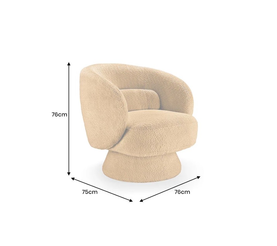 Základňa v tvare zrezaného kužeľa zaisťuje stabilitu a zároveň obsahuje otočný mechanizmus s rozsahom 360°, ideálny pre dynamické a štýlové bývanie. Súčasťou kresla je aj malý valcový vankúš, mierne ohnutý, ktorý poskytuje dodatočnú oporu v oblasti bedier alebo chrbta.