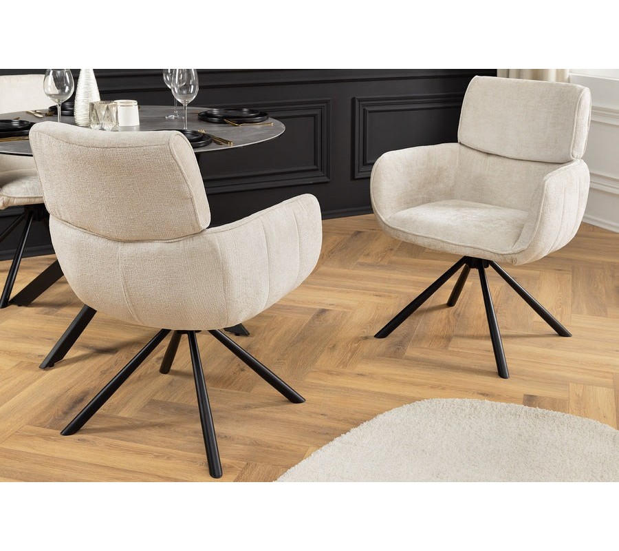 Moderné otočné zaoblené jedálenské kreslo Chenill s béžovým žinilkovým poťahom s opierkami na ruky s čiernymi nožičkami 84 cm
