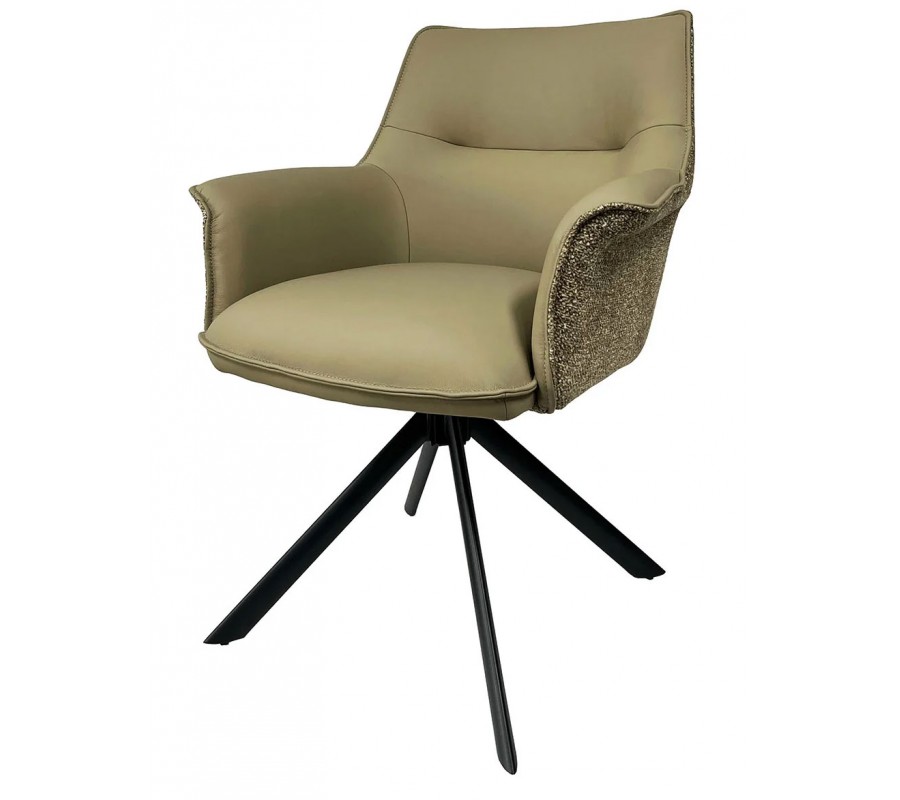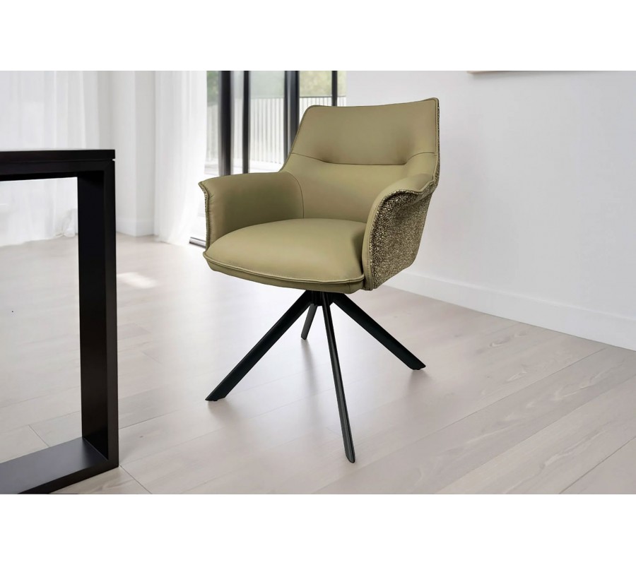 Predná časť kresla je potiahnutá prírodnou kožou v nápaditom zelenom odtieni, ktorá pôsobí prírodne a harmonicky. Zadná strana je čalúnená textíliou s výraznou štruktúrou v bielej a zelenej farbe. Tento kontrast medzi hladkým povrchom kože a textúrovanou zadnou stranou vytvára zaujímavý vizuálny detail.