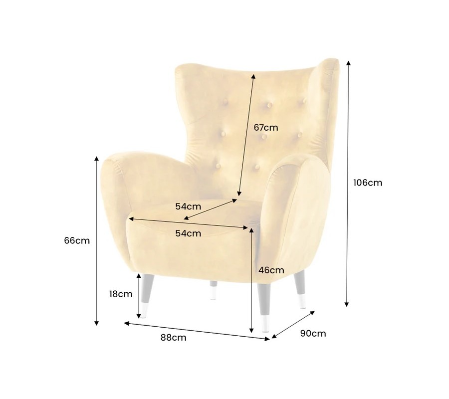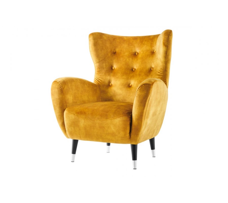 Tvar kresla je inšpirovaný retro dizajnom populárnych ušiakov. Vysoká chrbtová opierka s dekoratívnym prešívaním s okrúhlymi gombíkmi má do strán natiahnuté rohy, ktoré vytvoria útulný pocit pri sedení. Bočné opierky sú tiež zaoblené, s vyvýšenou vrchnou časťou a výborne korešpondujú s elegantnými krivkami chrbtovej opierky. Sedacia časť pôsobí robustným dojmom a v kombinácii mäkkou penovou výplňou tak kreslo poskytuje pohodlné sedenie aj počas dlhšieho času, napríklad pri sledovaní televízie či čítaní.