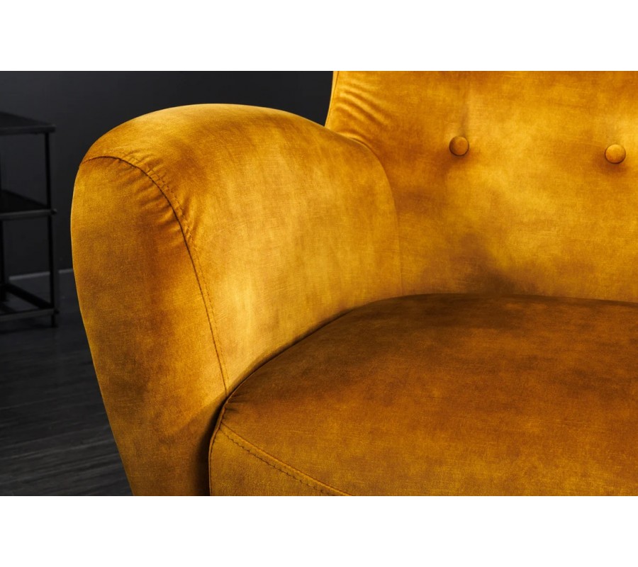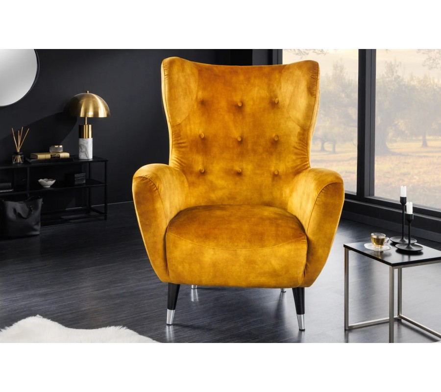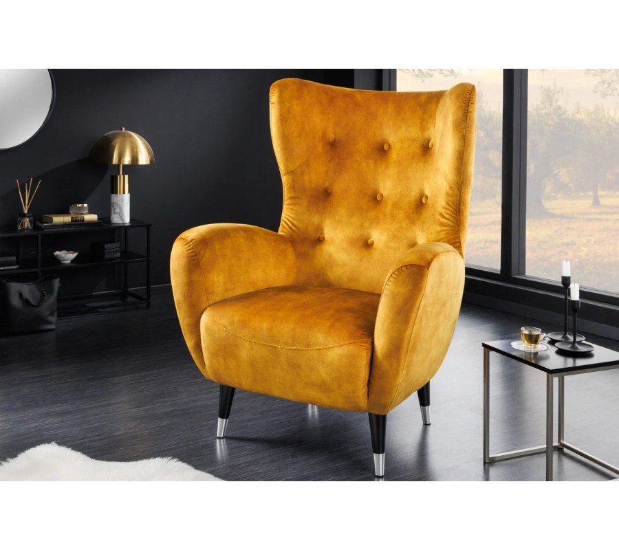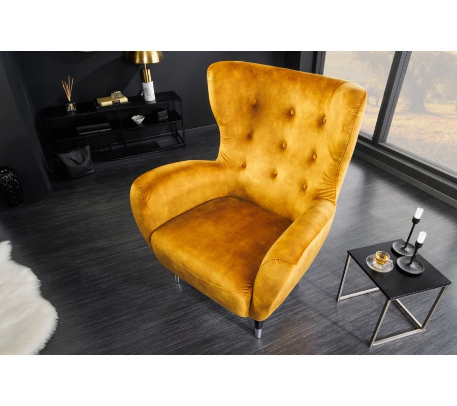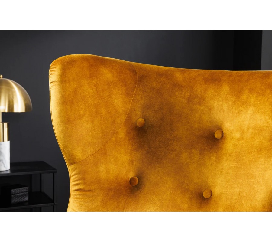 Art deco kreslo Bolte s horčicovým žltým zamatovým poťahom a vysokou chrbtovou opierkou s dizajnom ušiaka 106 cm