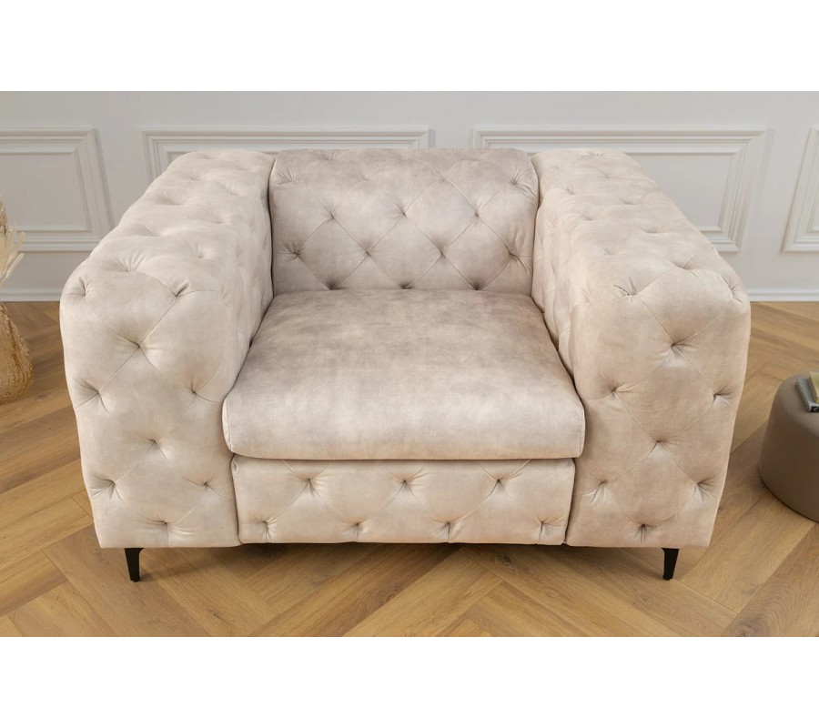 Moderné dizajnové kreslo Limonny s chesterfield prešívaním a zamatovým poťahom v šampanskej béžovej farbe 120 cm
