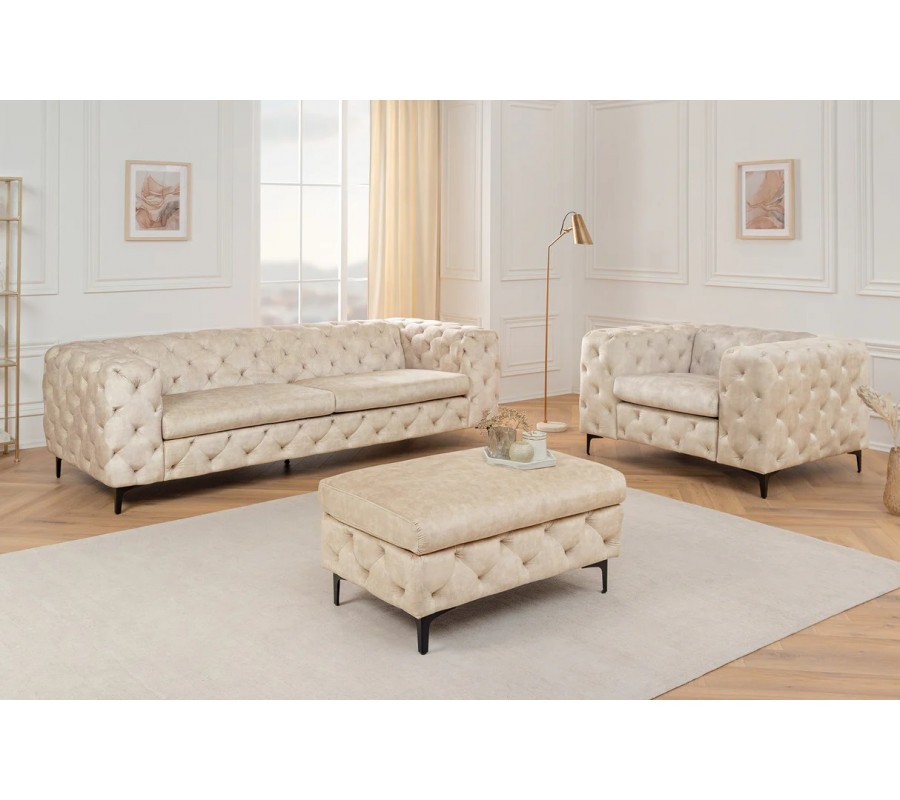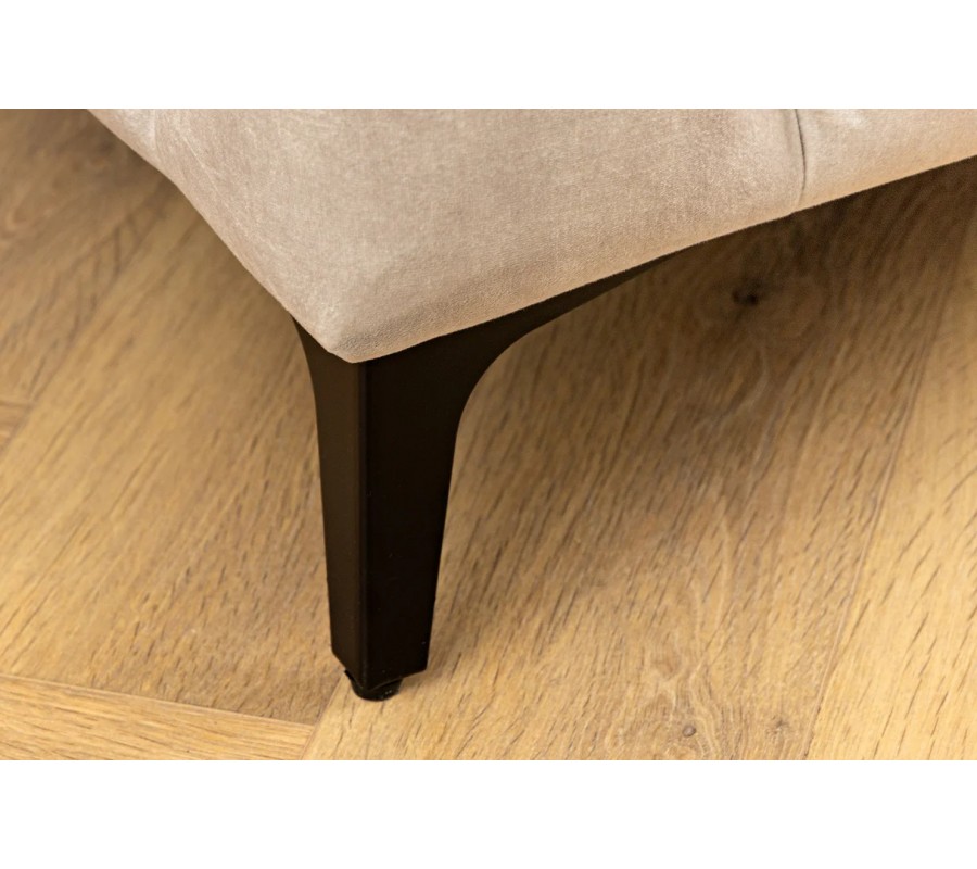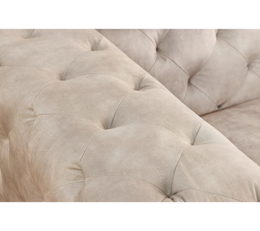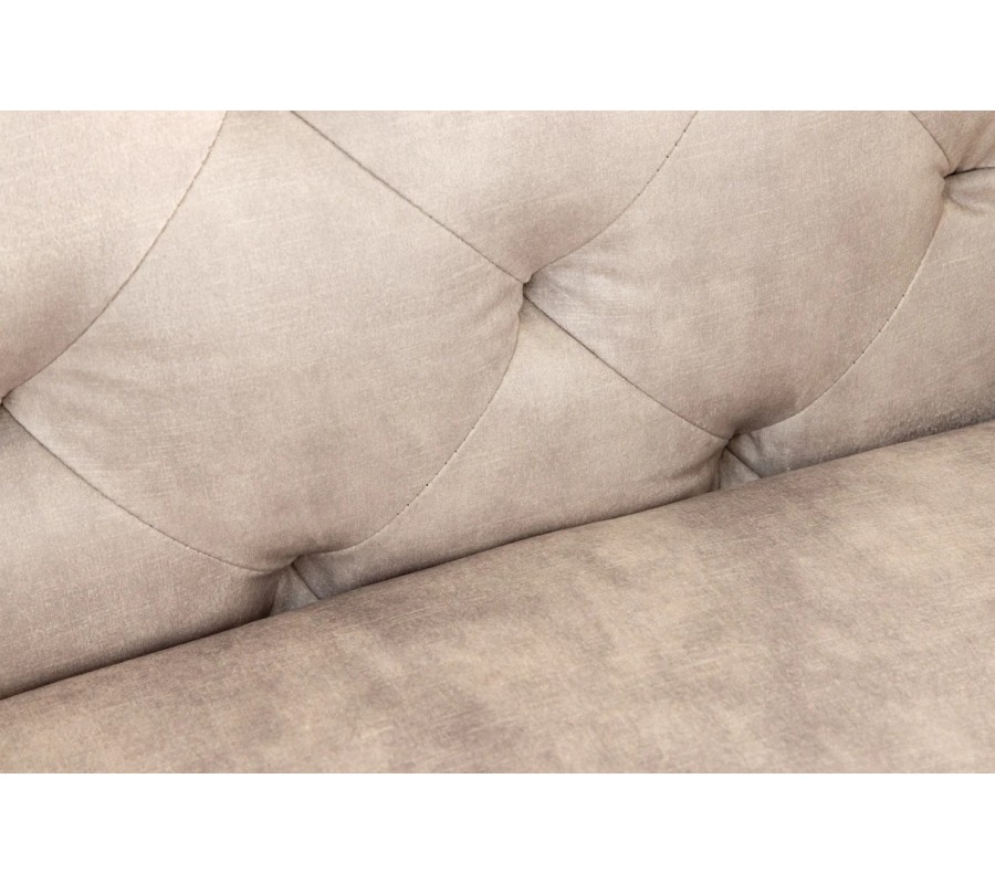 Penové čalúnenie pokrýva poťah z mikrovlákna so zamatovým finišom. Je príjemný na dotyk a zároveň mimoriadne odolný a nenáročný na údržbu. Prevedenie v šampanskom odtieni béžovej pôsobí v kombinácii so zamatovým leskom luxusným dojmom a hlboké bodové prešívanie inšpirované chesterfield štýlom zdôrazňuje robustnú siluetu.