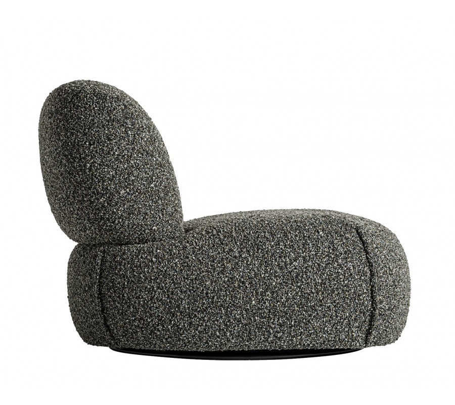 Silueta kresla je minimalistická a vďaka jednotnému poťahu pôsobí až skulpturálnym dojmom. Sedacia časť má mohutný okrúhly tvar, s výrazným vertikálnym prešívaním na stranách, ktoré vytvára štyri pomyselné rohy. Na zadnej strane je umiestnená jemne zakrivená chrbtová opierka obdĺžnikového tvaru. Má výrazne zaoblené hrany, ktoré výborne korešpondujú so sedacou časťou. Kreslo je postavené na nízkej diskrétnej podstave okrúhleho tvaru v čiernej farbe z masívneho dreva.