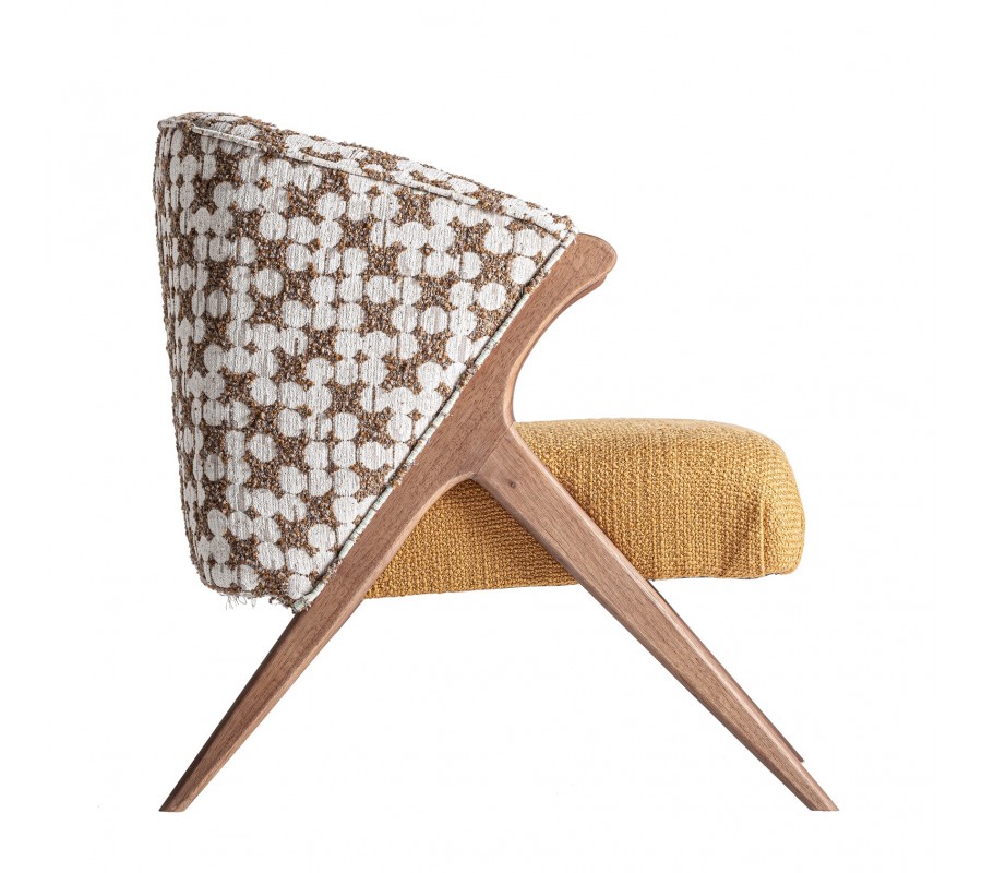 Luxusné dizajnové čalúnené kreslo Brilon s hnedým dreveným rámom a žltým sedadlom so vzorovanou hnedobielou opierkou 80 cm