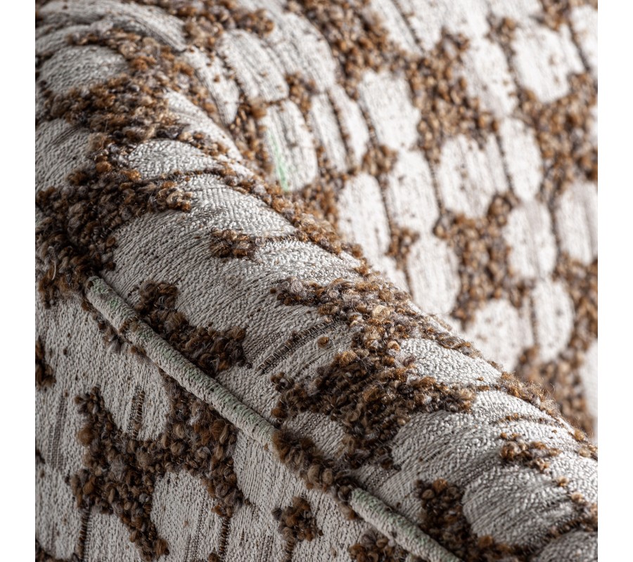 Dizajnu dominuje mohutná chrbtová opierka, ktorá siaha na zadnej strane až po spodok sedacej časti a na bokoch prechádza do dvoch trojuholníkových prvkov. Poťah má bielo-hnedý asymetrický bodkovaný vzor. Zaujímavým detailom je aj kombinácia hladkého výpletu na svetlých častiach s výraznejšou štruktúrou, pripomínajúcou buklé v hnedej farbe.