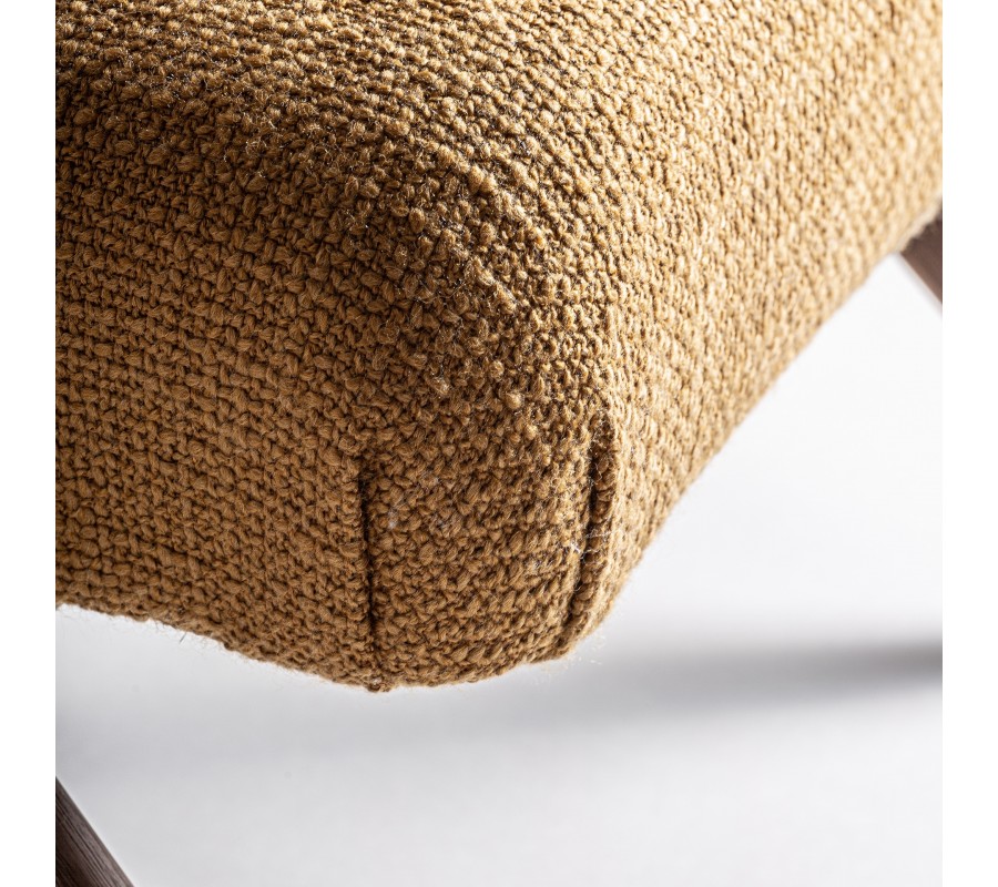 Sedacia časť má obdĺžnikový tvar, s bohatým čalúnením, ktoré zjemňuje jej línie. Pokrýva ju poťah s výrazným tkaním v horčicovej žltej farbe. Svojím teplým charakterom korešponduje s odtieňmi opierky a zároveň prináša do dizajnu živý akcent.