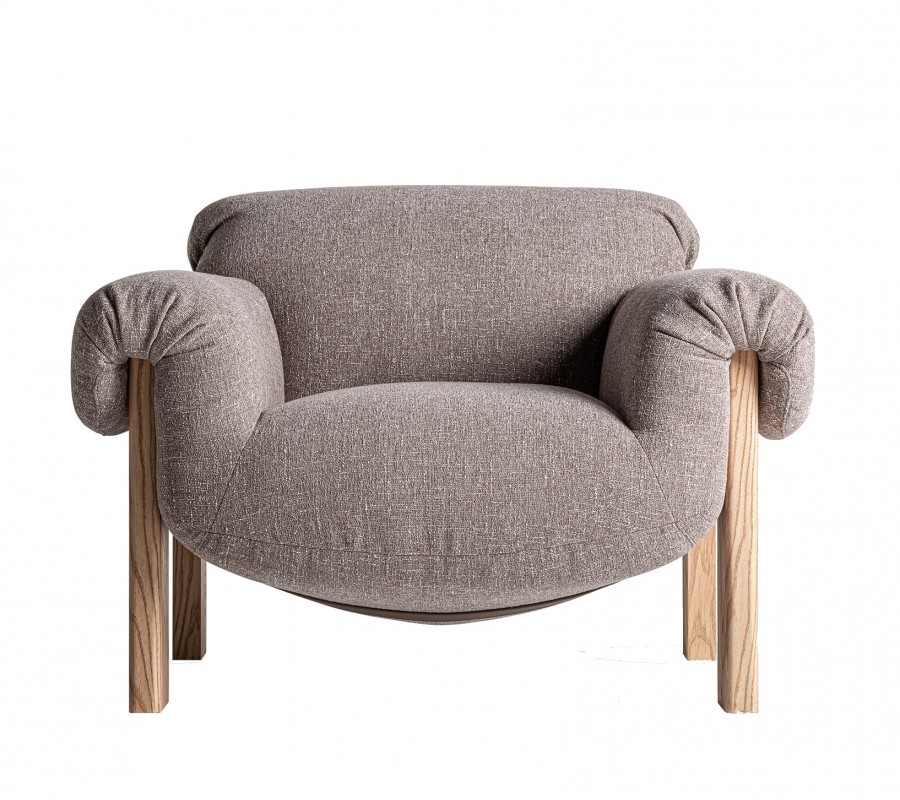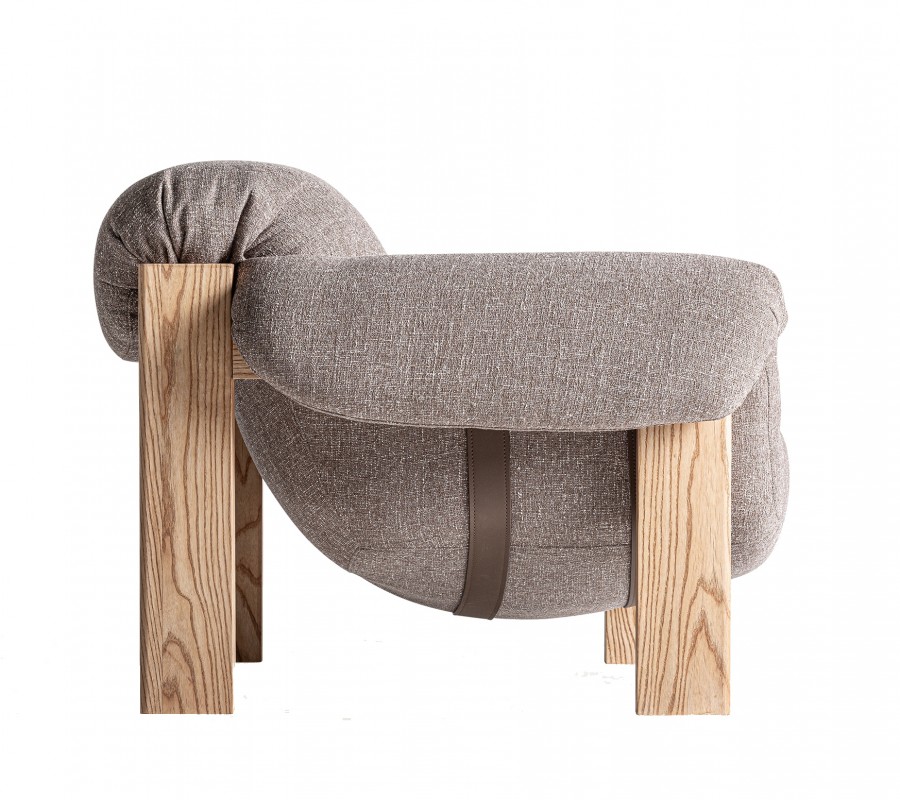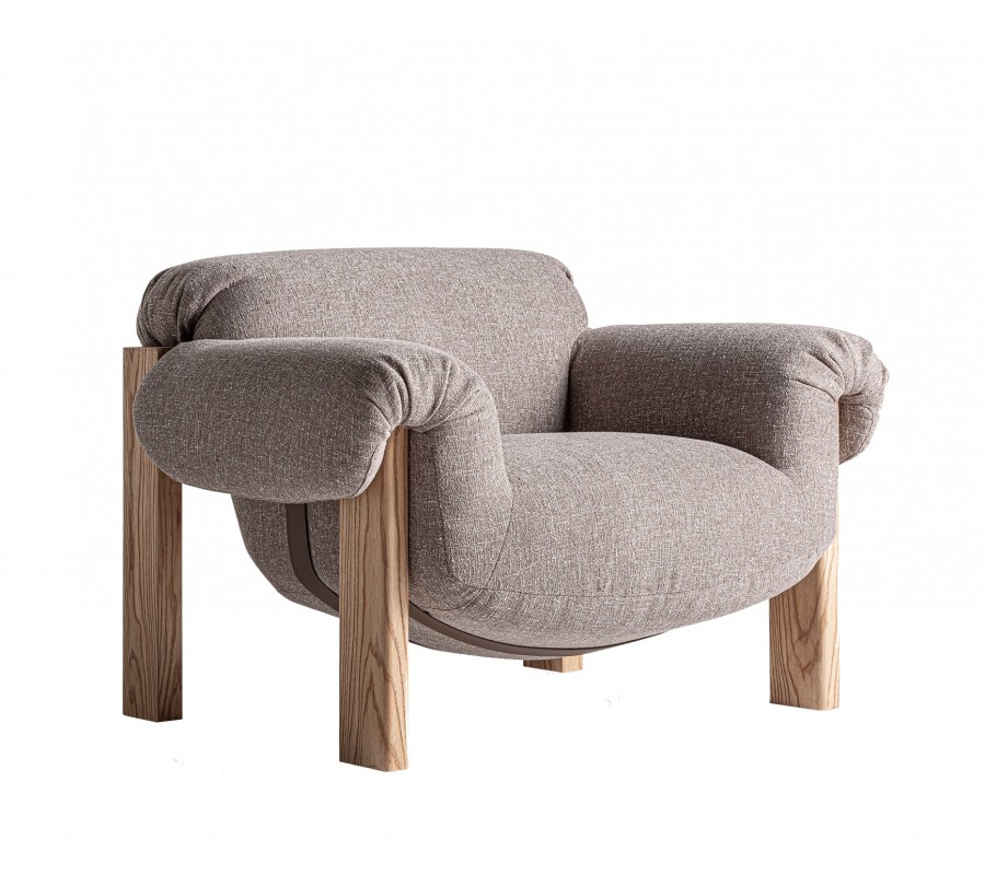 Kreslo má pevný rám, vyrobený z masívneho dreva. Tvoria ho štyri nohy s plochým profilom, prepojené na zadnej a bočných stranách lineárnou výstuhou. Prevedenie v naturálnej svetlej hnedej farbe s výraznou kresbou letokruhov pôsobí organickým dojmom a výborne korešponduje so zaoblenými tvarmi sedadla a opierky.