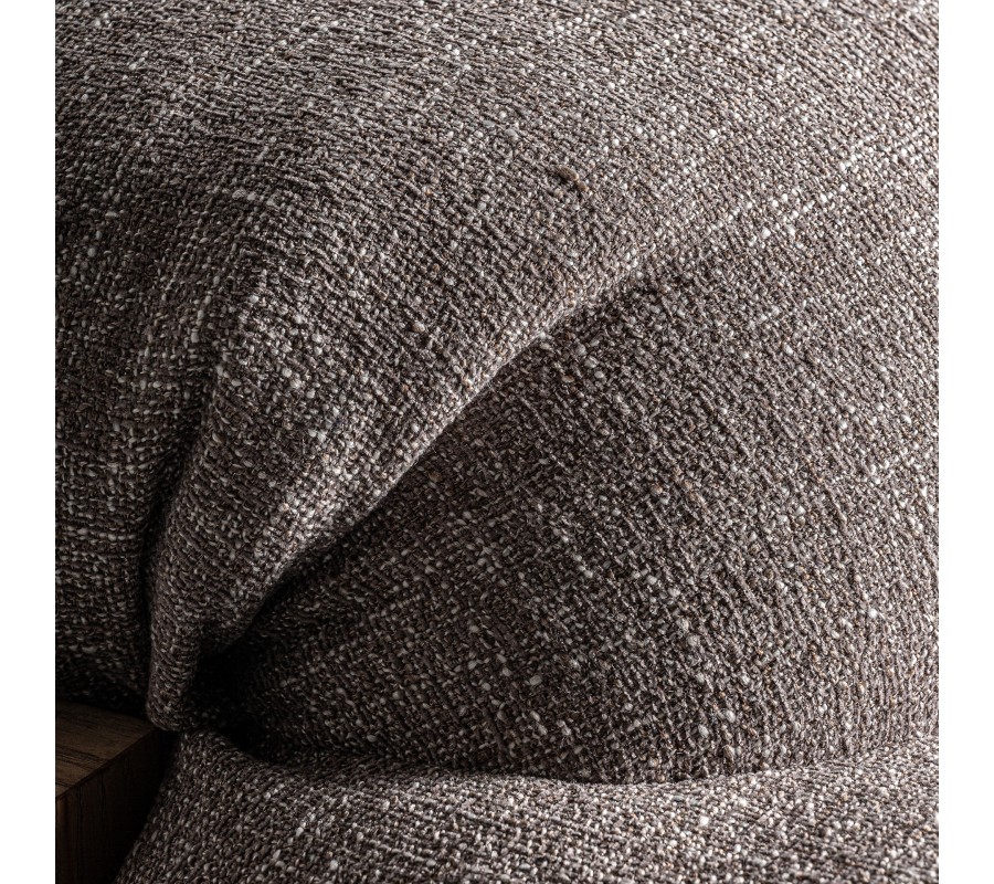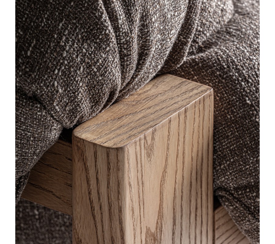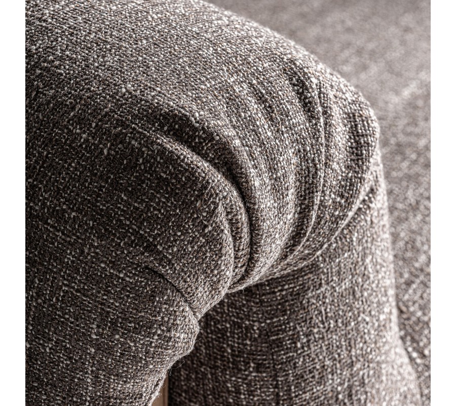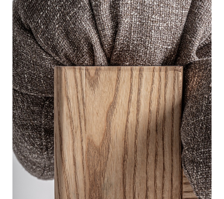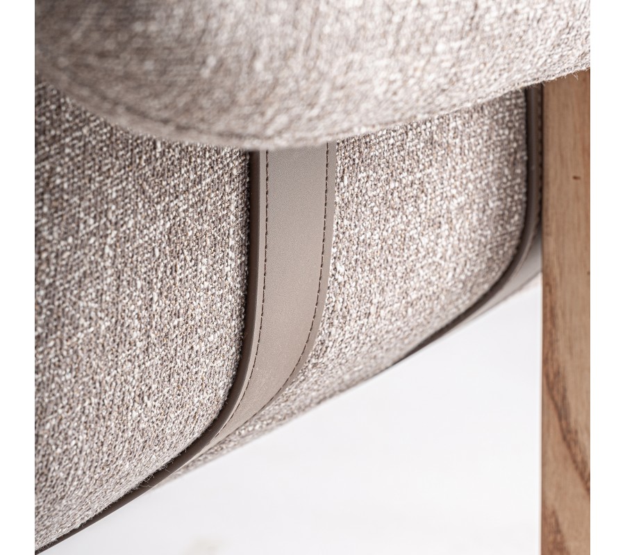 Sedacia časť je bohato čalúnená a pokrýva ju poťah v melírovanej sivej farbe. Tmavšie odtiene sú kombinované so svetlejším vláknom a vytvárajú tak subtílnu mramorovanú štruktúru. Sedadlo plynule prechádza do bočných opierok, ktoré sú upevnené na výstuhách rámu a pôsobia ako ležérne prehodené. Rovnaký dizajn má aj chrbtová opierka. Spodnú časť ešte spevňuje popruh, natiahnutý popod sedadlo.