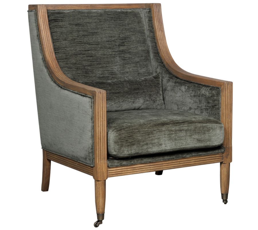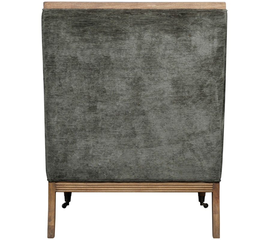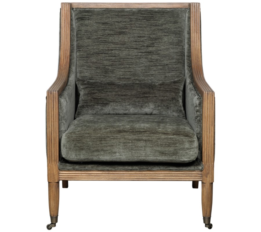 Kreslo má elegantnú siluetu s historickým nádychom. Vysoká hranatá chrbtová opierka sa prelamuje do úzkych bočníc, ktoré následne klesajú v elegantnej krivke do opierok na ruky. Sedadlo dopĺňa mohutný, bohato čalúnený vankúš na sedenie a menší obdĺžnikový vankúš na podporu chrbtice. Poťah je vyrobený zo zamatu v olivovej zelenej farbe, ktorý je príjemný na dotyk.