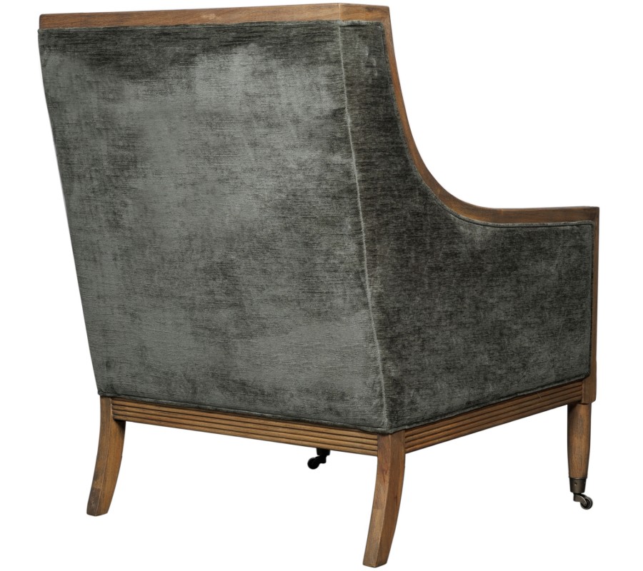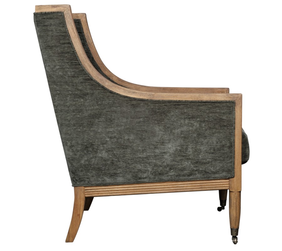 Okraje opierok a spodnú hranu sedacej časti lemuje drevený rám. Zdobí ho lineárne vyrezávanie, zdôrazňujúce klasické tvary kresla. Predné nožičky majú valcovitý tvar a v spodnej časti ich dopĺňajú kolieska, ktoré dodávajú nábytku originálny vintage detail. Zadné nožičky sú hranaté a výrazne prehnuté, čím vizuálne nadväzujú na zošikmenú líniu opierky. Drevo má naturálnu teplú hnedú farbu s viditeľnou kresbou letokruhov.