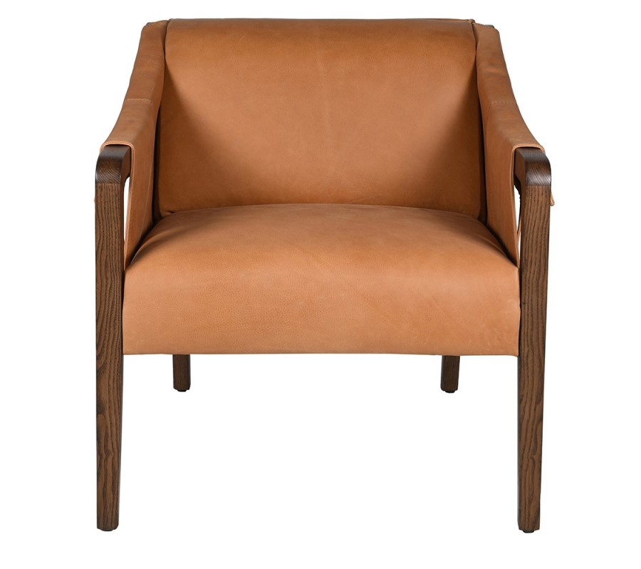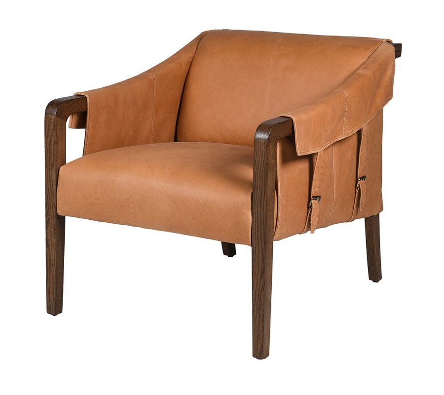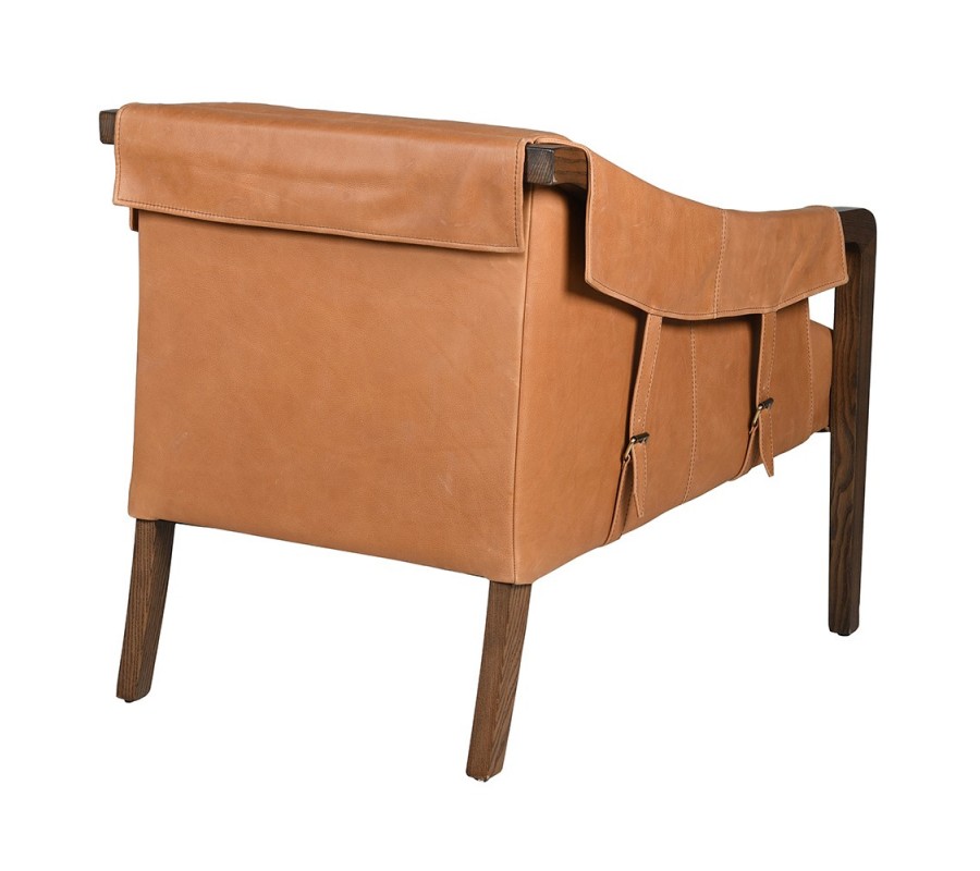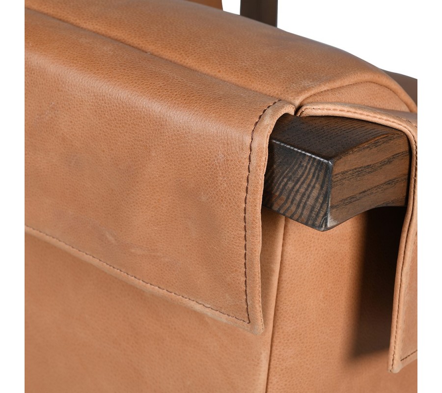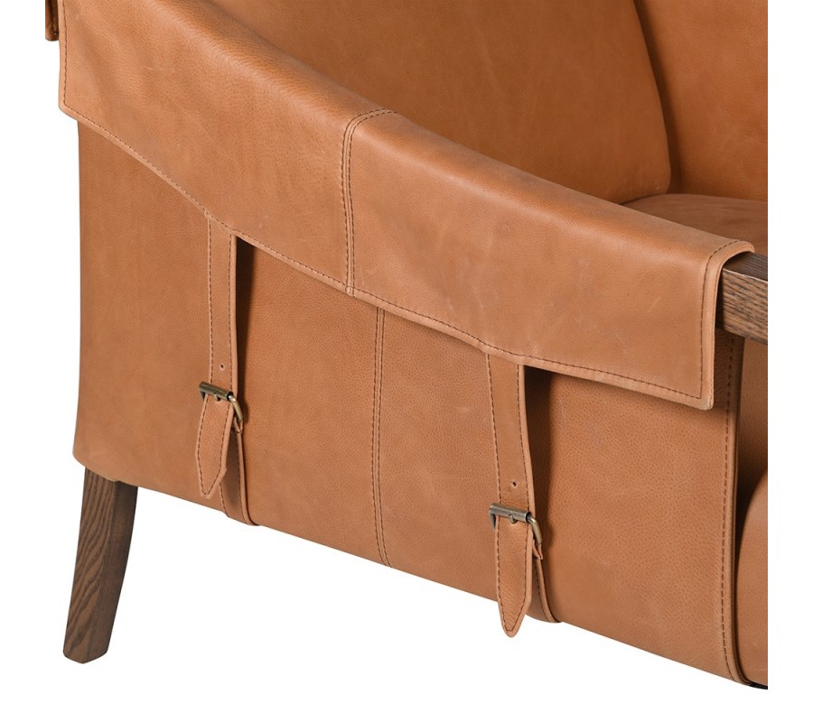 Sedadlo a operadlo sú bohato čalúnené a potiahnuté kvalitnou kožou, ktorá zaručuje komfort aj dlhú životnosť. Bočné opierky majú atypické prevedenie – nie sú čalúnené, ale potiahnuté rovnakou kožou, ktorá je uchytená pomocou remienkov a kovových zapínaní v štýle opaskov. Tento detail dodáva kreslu remeselný charakter a dobrodružný vzhľad, ktorý pripomína safari interiéry či cestovateľské salóny koloniálnej éry.