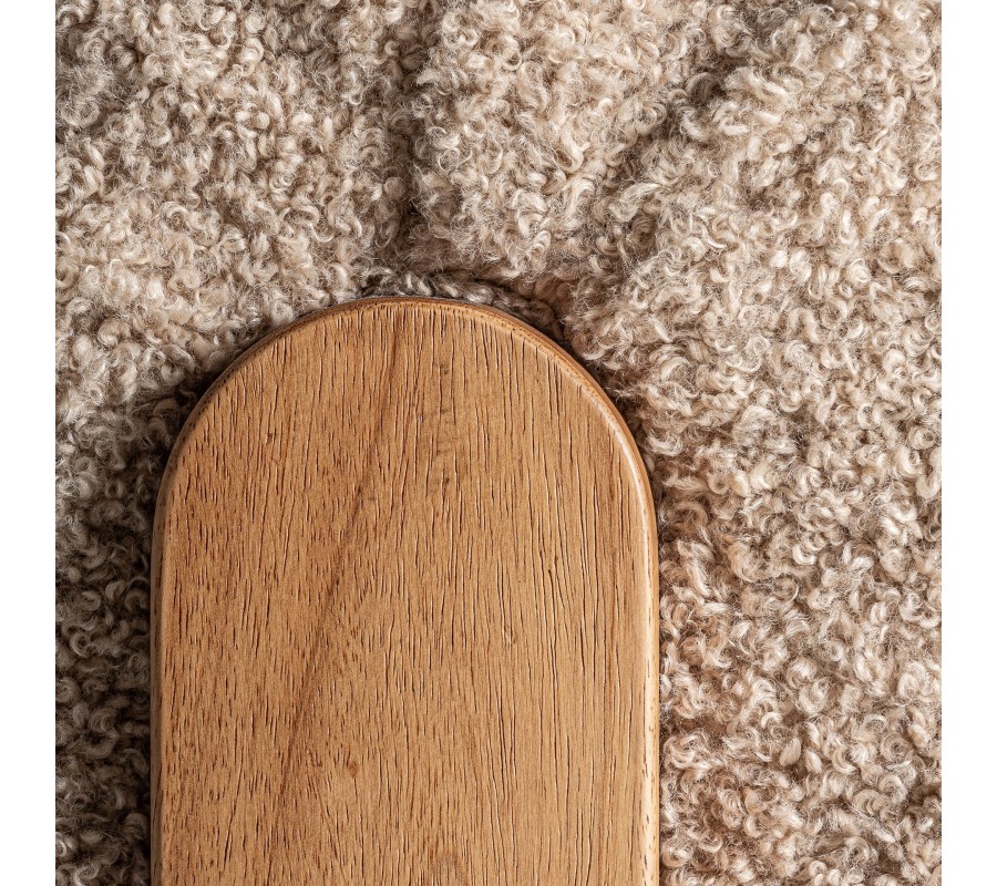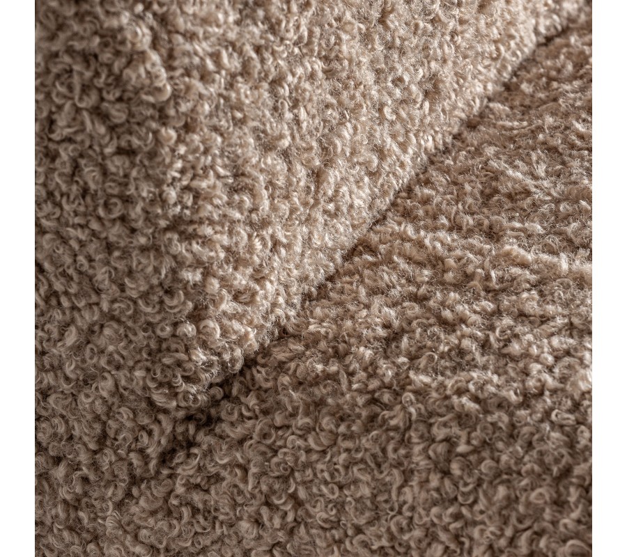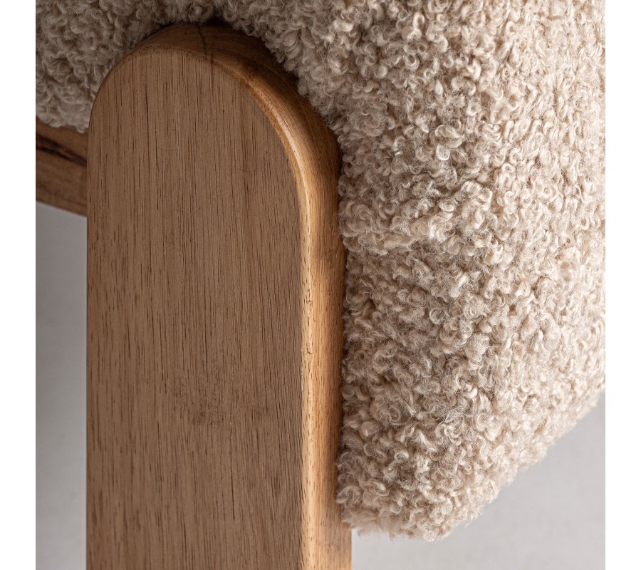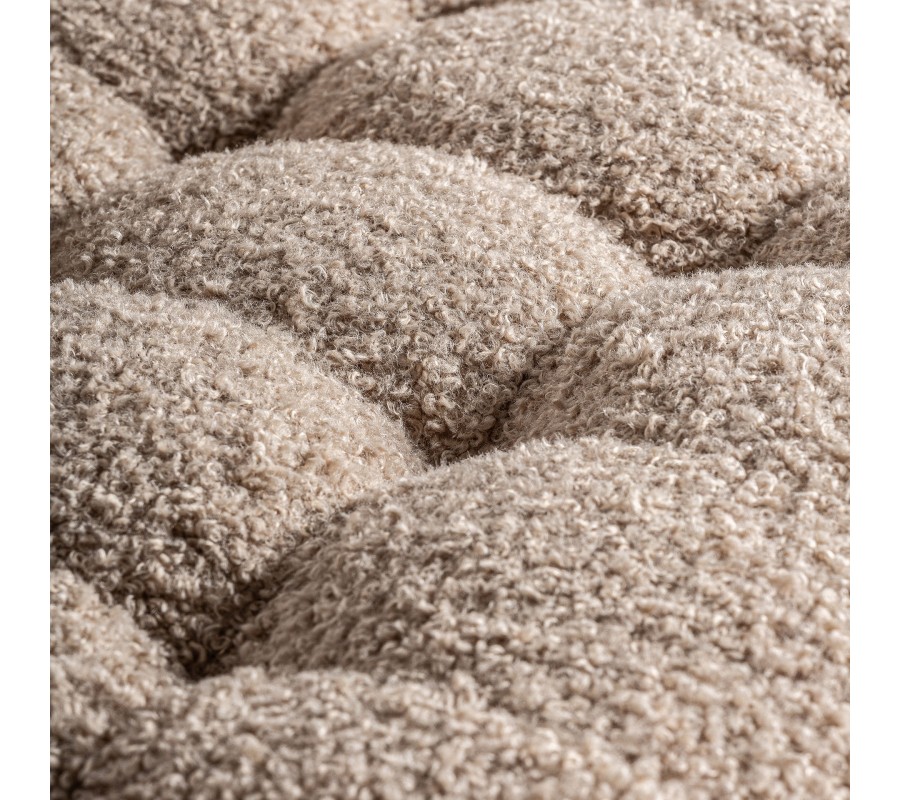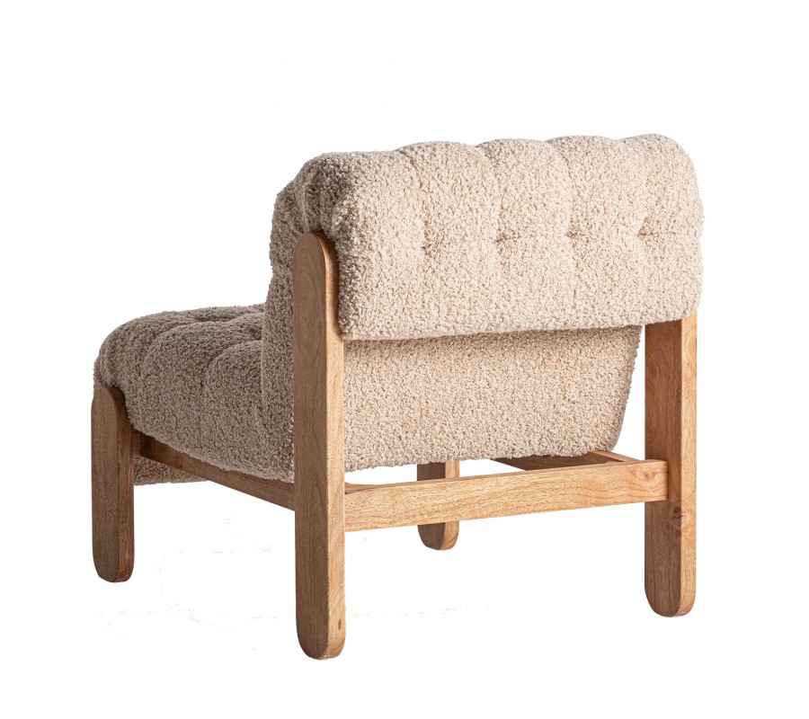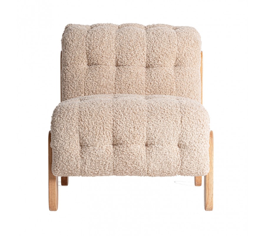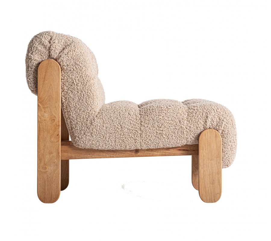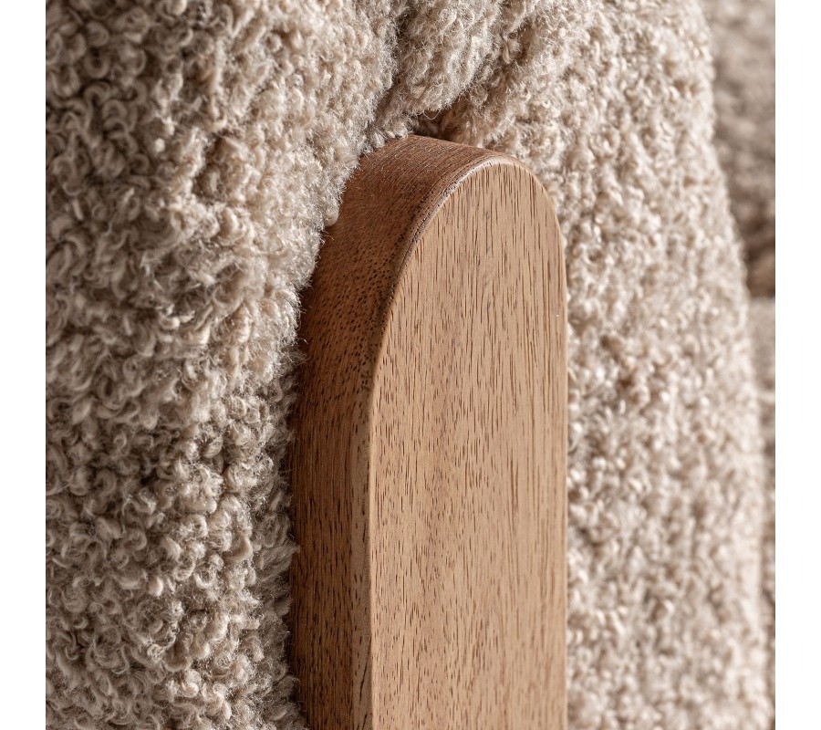 Kreslo Aliona je dizajnový kúsok s jemným retro šarmom, ktorý upúta na prvý pohľad kombináciou luxusného bouclé poťahu a masívnej drevenej konštrukcie. Zaoblené operadlo plynulo prechádza do sedacej časti, čím vzniká jednoliaty, pohodlný celok ideálny na oddych. Celá čalúnená časť je bohato vystužená a prešívaná do štvorčekového vzoru, ktorý zvýrazňuje tvar a textúru mäkkej tkaniny. Poťah z béžového bouclé materiálu pôsobí hrejivo, mäkko a útulne, čím vnáša do interiéru pocit pohodlia a tepla.