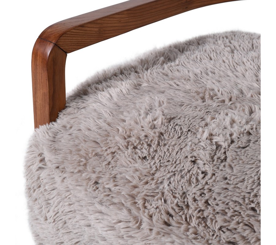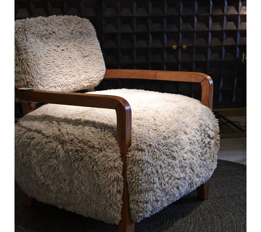 Kreslo má mohutnú čalúnenú sedaciu časť obdĺžnikového tvaru, ktorá je upevnená v masívnom drevenom ráme. V zadnej časti ju dopĺňa obdĺžniková opierka v rovnakom prevedení, ktorá nie je priamo napojená na sedadlo. Penové čalúnenie dodáva nábytku elegantné zaoblené tvary, ktoré ešte zjemňuje poťah z umelej kožušiny v svetlej béžovej farbe. Vysoký vlas je príjemný na dotyk a vytvára mimoriadne útulný vizuál.