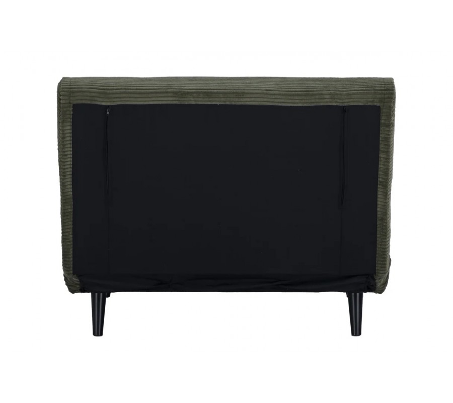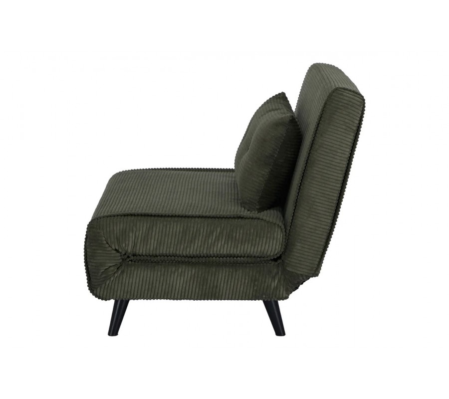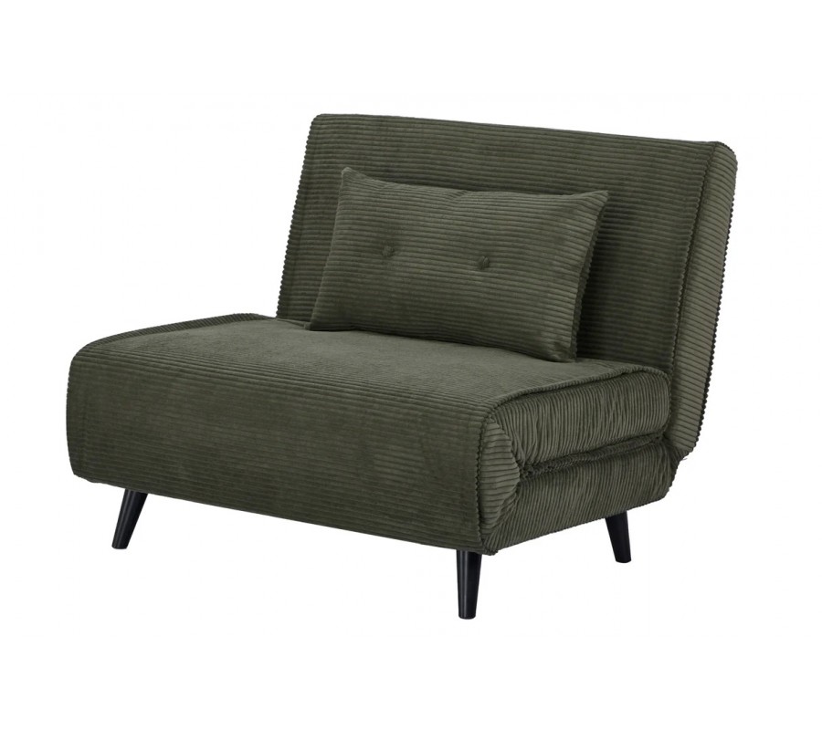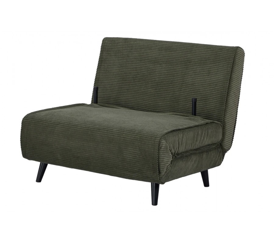 Dizajnové škandinávske rozkladacie menčestrové kreslo Kurt v olivovo zelenej farbe s čiernymi nožičkami 100 cm