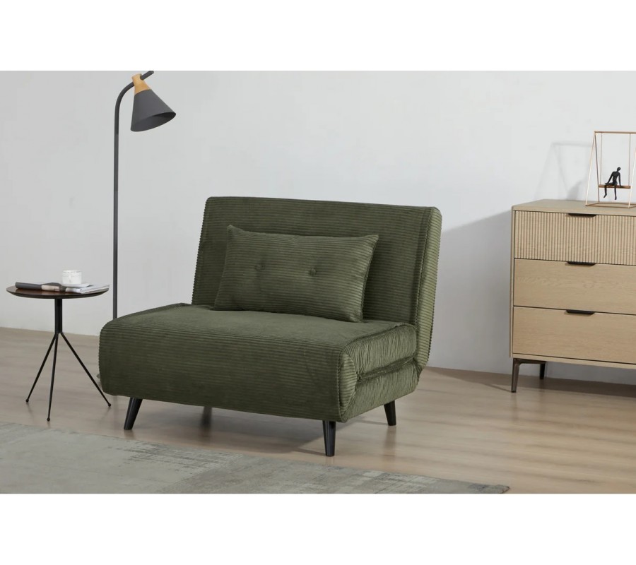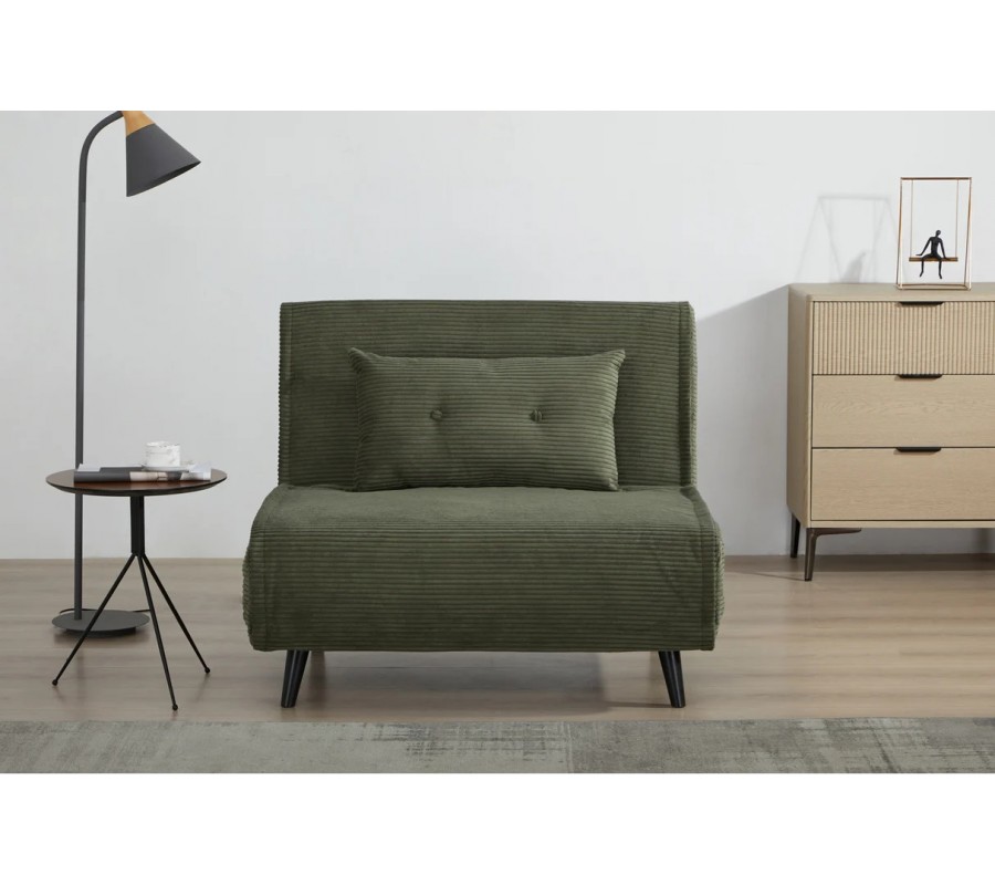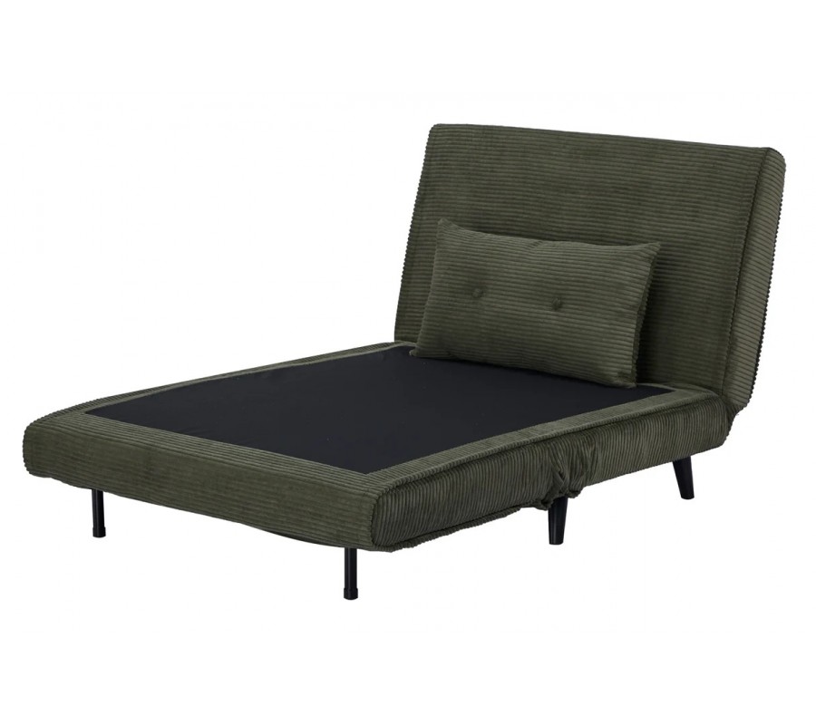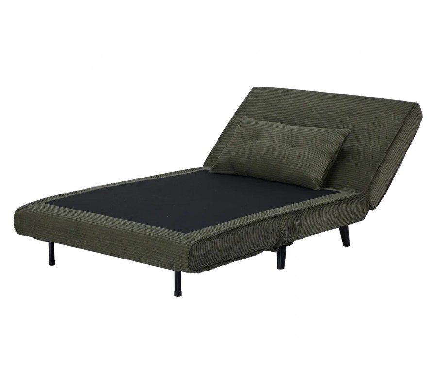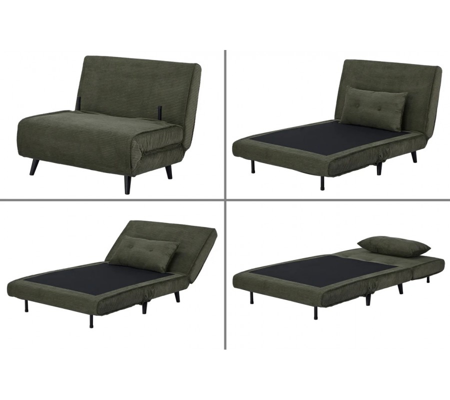 Dizajnové škandinávske rozkladacie menčestrové kreslo Kurt v olivovo zelenej farbe s čiernymi nožičkami 100 cm