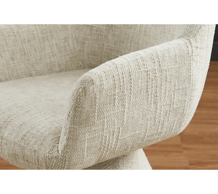 Stolička má pevnú konštrukciu, vyrobenú z dreva a kovu, ktorú na celej ploche pokrýva ženilkový poťah. Je charakteristický svojím plyšovým vizuálom s jemným zamatovým odleskom. Výrazné tkanie vytvára konštantný štruktúrovaný vzhľad a materiál je zároveň príjemný na dotyk. Svetlá krémovo béžová farba je nadčasová a dodáva stoličke skulpturálny charakter.