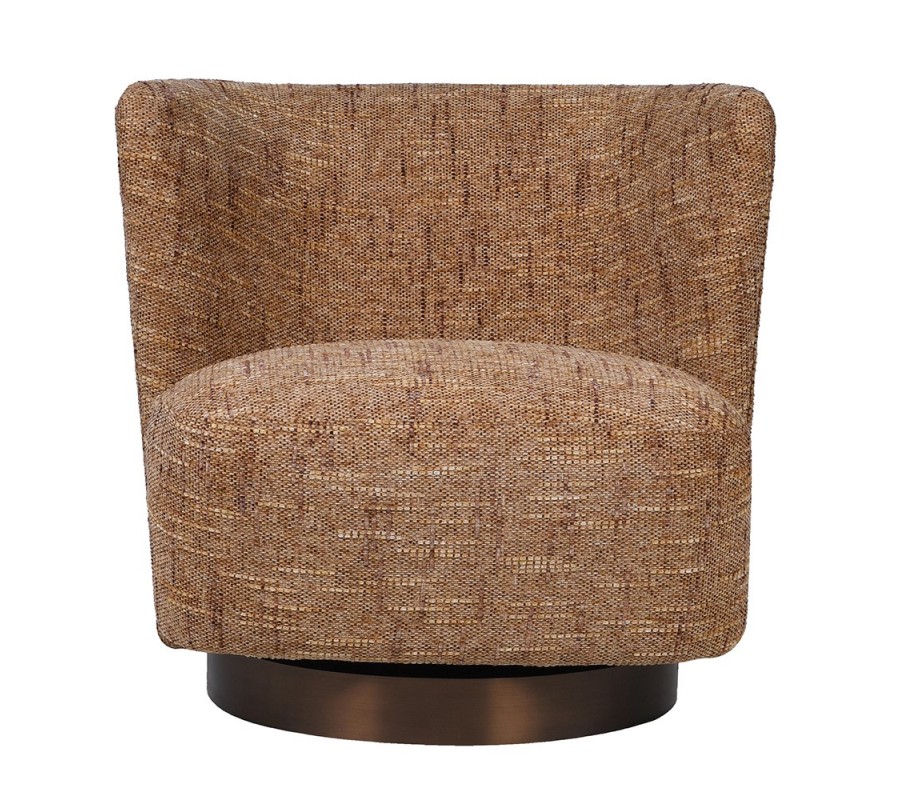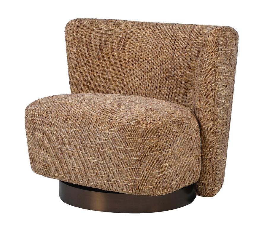 Luxusné art deco hnedé kreslo Doria s okrúhlou kovovou podstavou a textilným poťahom v hnedej farbe 77 cm
