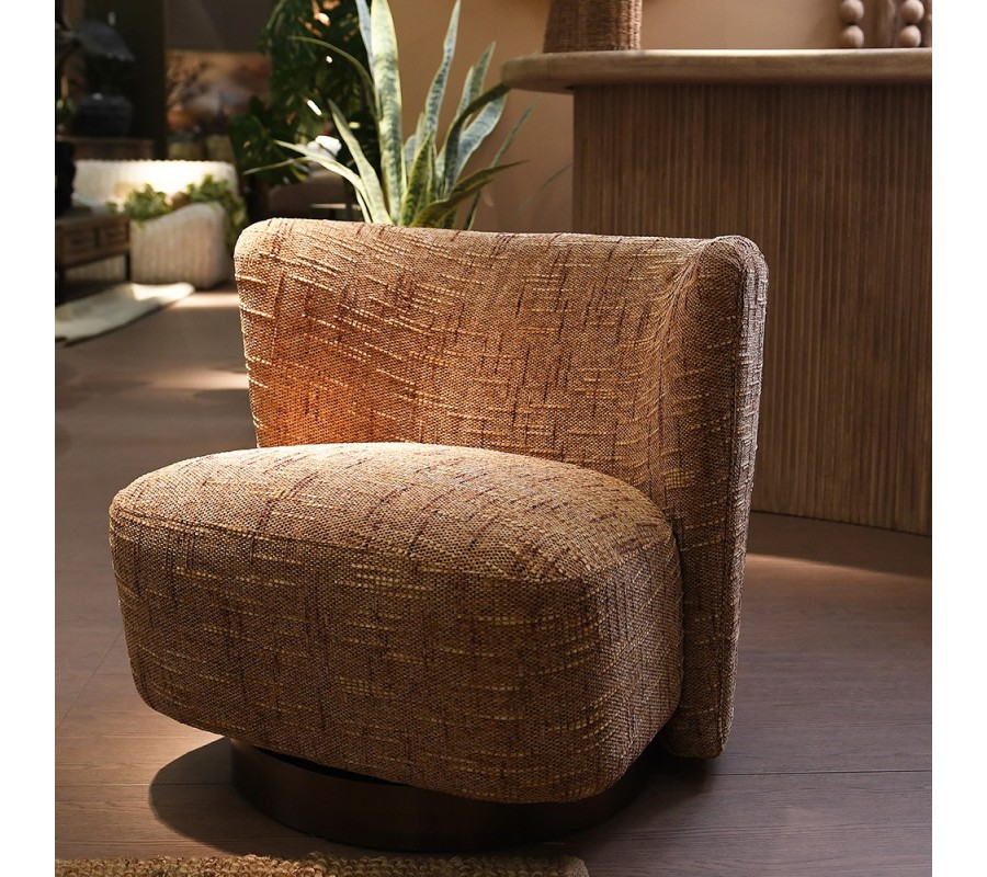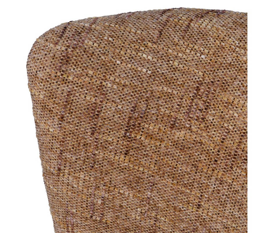 Silné čalúnenie vyniká jemne štruktúrovaným textilným poťahom v teplej hnedej farbe, ktorý pôsobí sofistikovane a zároveň útulne. Zaoblené operadlo je ergonomicky tvarované, plynule sa spája so sedacou časťou a pokračuje až k spodnej zadnej hrane podstavca, čím vytvára jednoliaty elegantný celok.