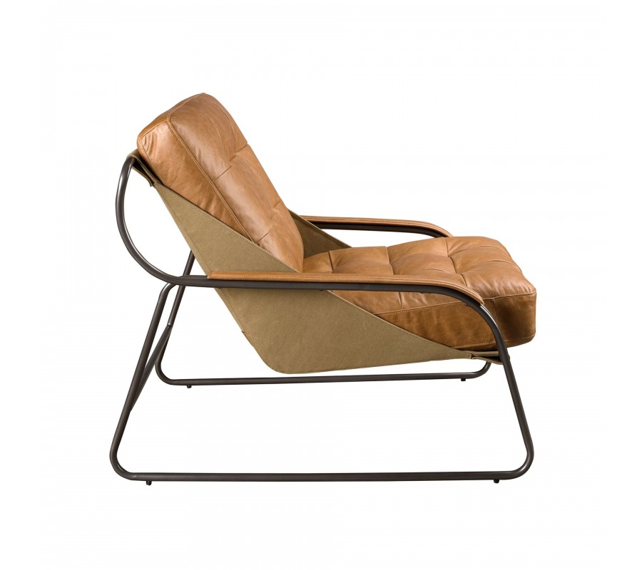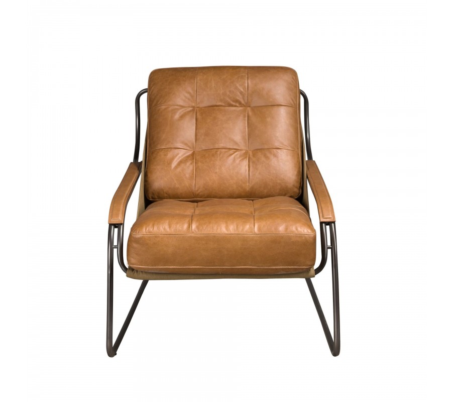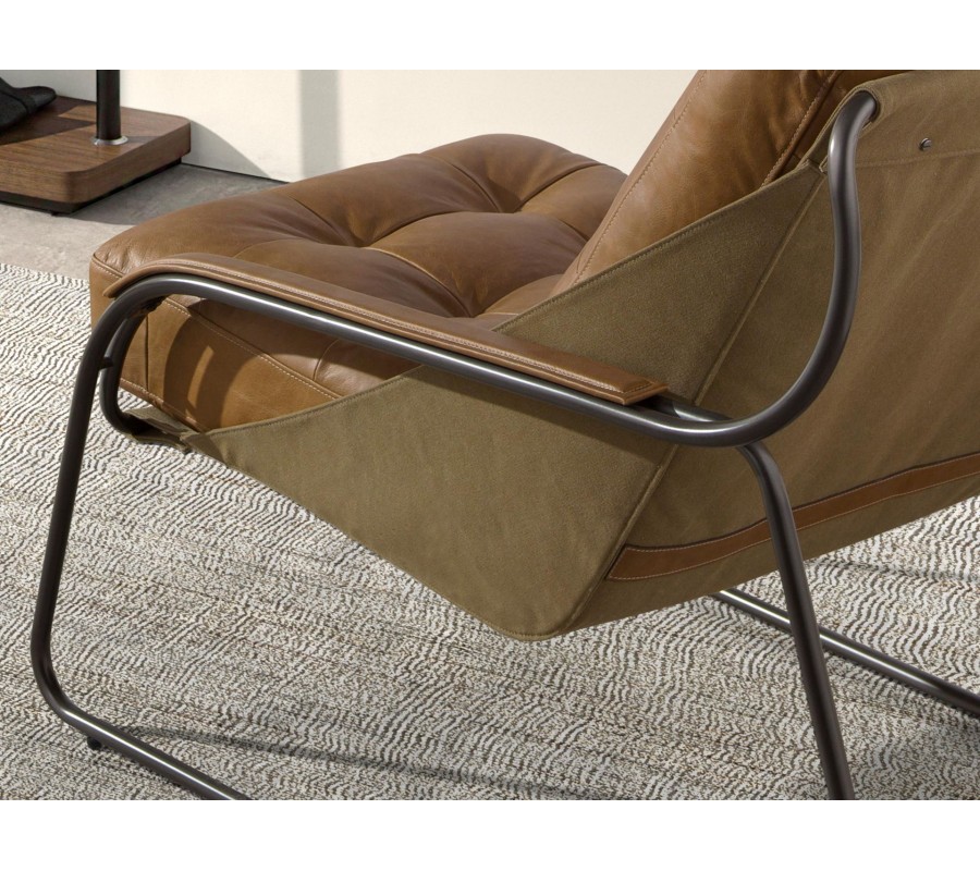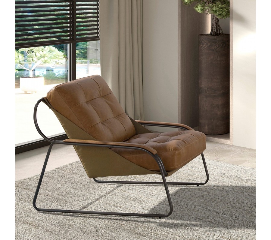 Sedadlo a chrbtová opierka majú obdĺžnikový tvar a sú bohato čalúnené. Poťah je vyrobený z pravej kože v teplom hnedom odtieni a zdobí ho minimalistické prešívanie so štvorcovým vzorom s hlbokými vtiahnutými bodmi. Rovnaký poťah, ale bez čalúnenia, prekrýva aj vrchnú časť bočných opierok a poskytuje tak pohodlnejšie opretie. Zo spodnej a zadnej strany ich spevňuje koža v svetlejšom hnedom odtieni, upevnená na kovovej konštrukcii. Vytvára subtílny farebný kontrast a priznané konštrukčné prvky prinášajú do dizajnu jemný nádych industriálneho štýlu.