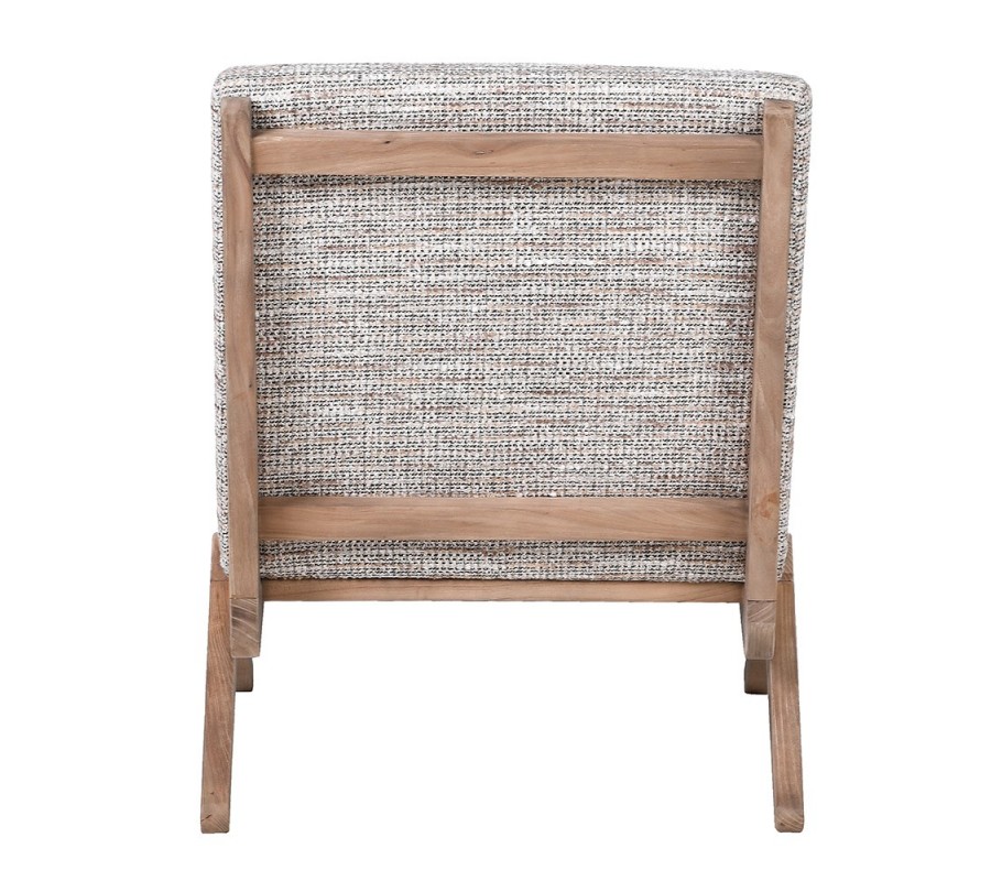 Drevená konštrukcia v orechovom hnedom odtieni tvorí výrazný dizajnový prvok. Nožičky majú dynamický architektonický tvar, kde sa ich horné línie jemne pretínajú, čo pripomína motív skríženia, no zachováva čistý a stabilný profil. Ich mierne vyosenie dopredu a dozadu dodáva kreslu rovnováhu a vizuálnu ľahkosť.