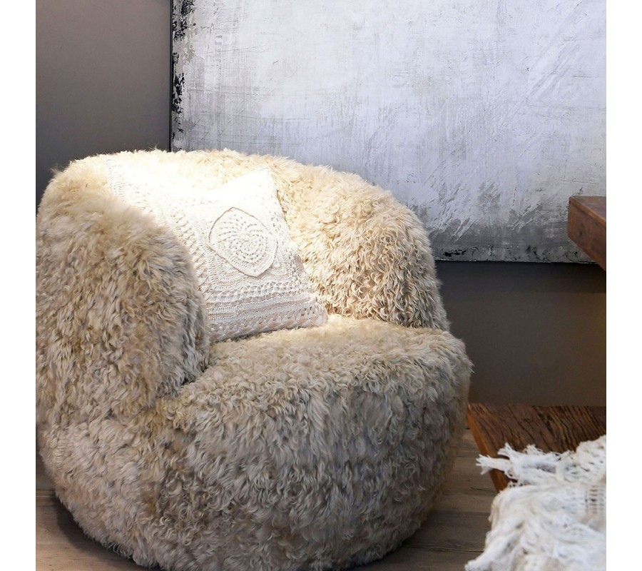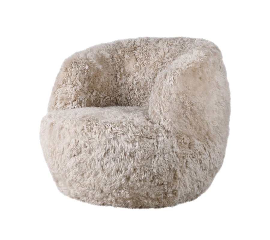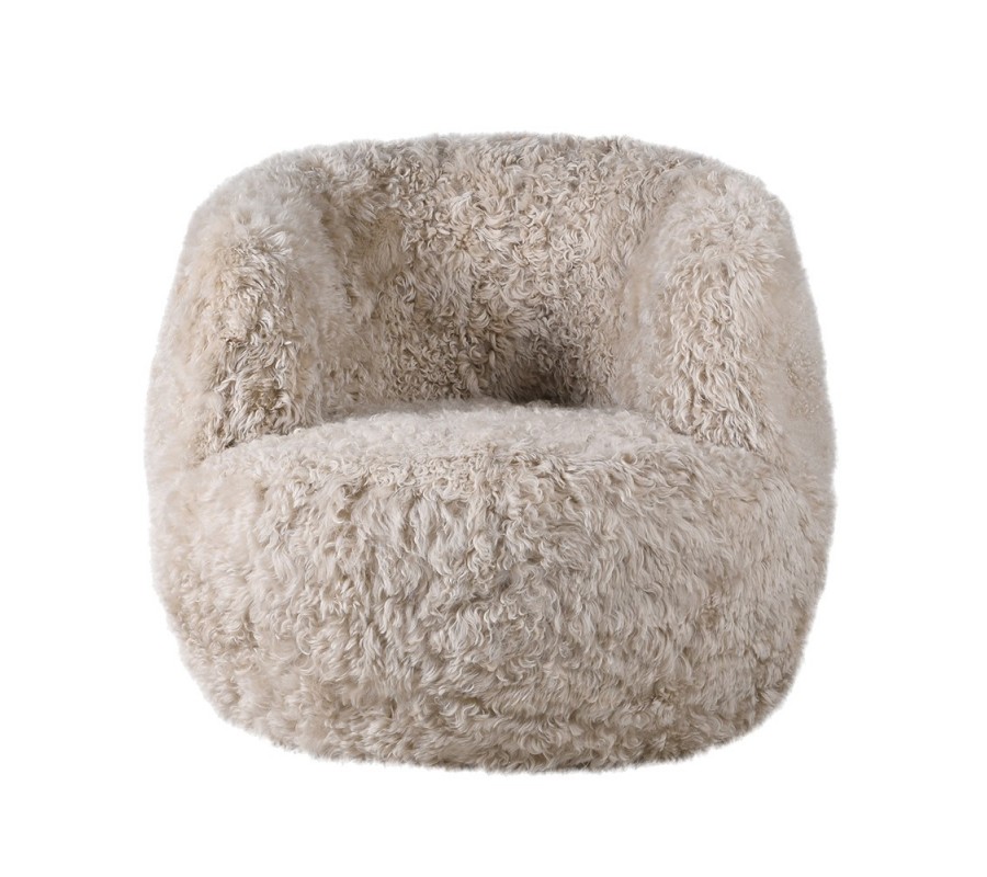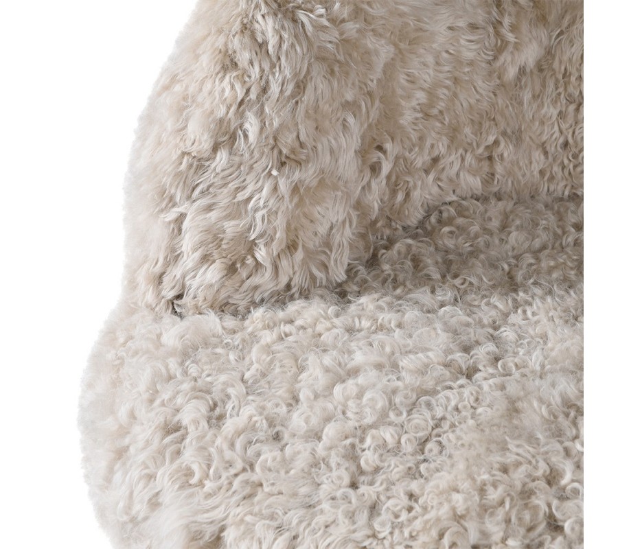 Poťah je vyrobený z prírodnej kožušiny s krátkym vlasom, ktorá kreslu dodáva mäkkosť, vizuálne teplo a exkluzívny glamour charakter. Skrytá otočná základňa umožňuje plynulé otáčanie bez rušivých nožičiek, vďaka čomu kreslo pôsobí ako kompaktný, nadýchaný objem. Vnútorná drevená konštrukcia zabezpečuje stabilitu a dlhodobú pevnosť.
