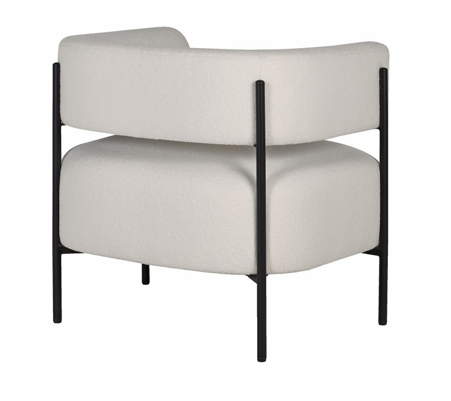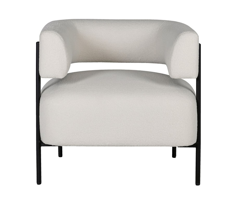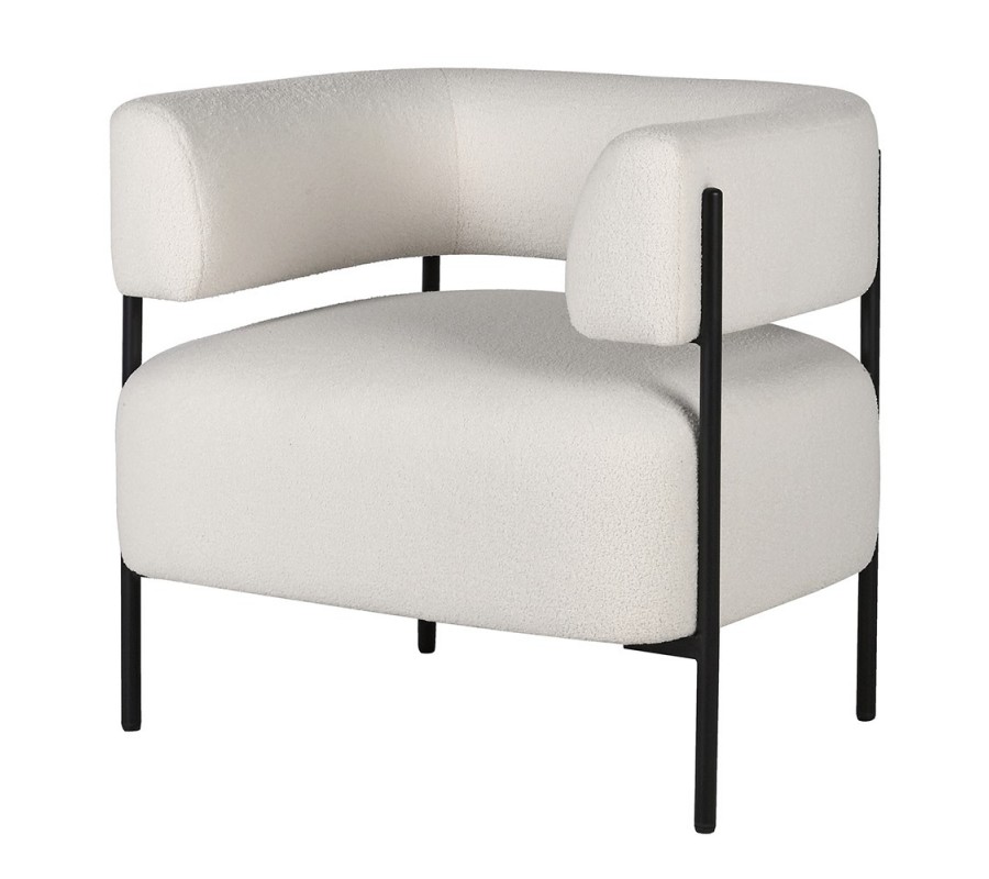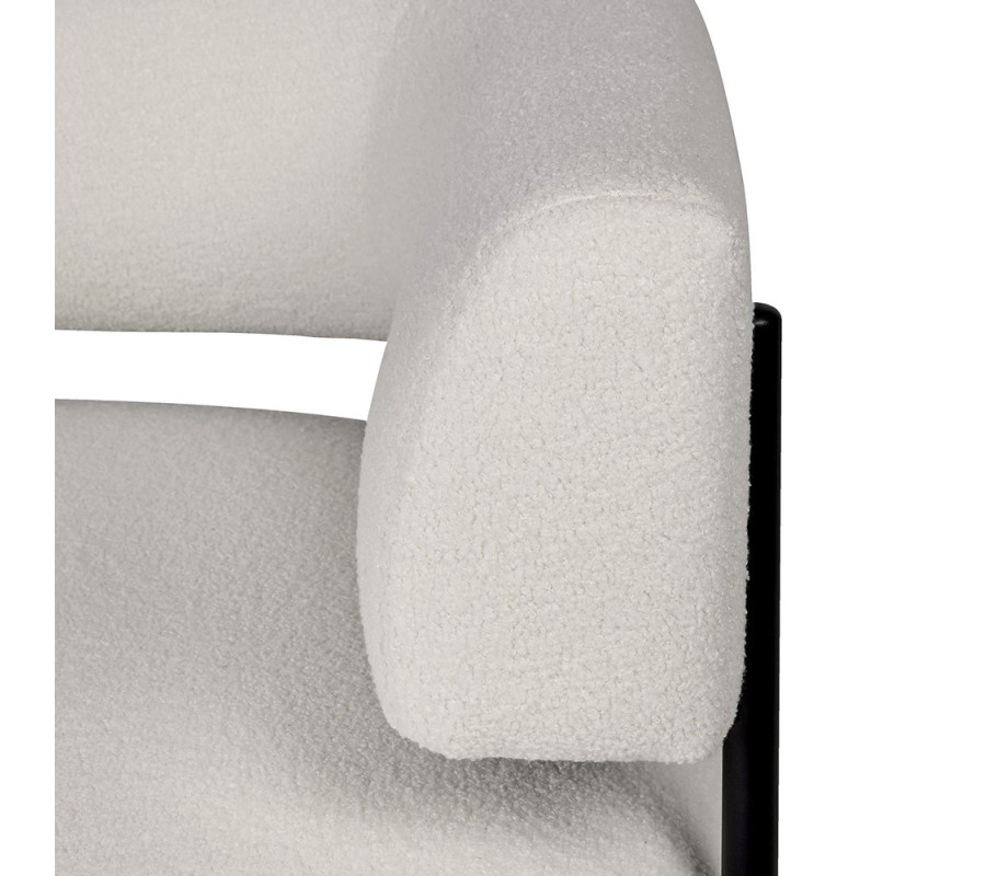 Kreslo má pevnú konštrukciu z kaučukovníkového dreva, prekrytú penovou výplňou a poťahom z mikrovlákna v štýlovej buklé povrchovej úprave. Štruktúra látky je bohatá, mäkká a mimoriadne príjemná na dotyk. Biele farebné prevedenie v off white odtieni pôsobí čistým a elegantným dojmom, zdôrazňujúcim moderný štýl.