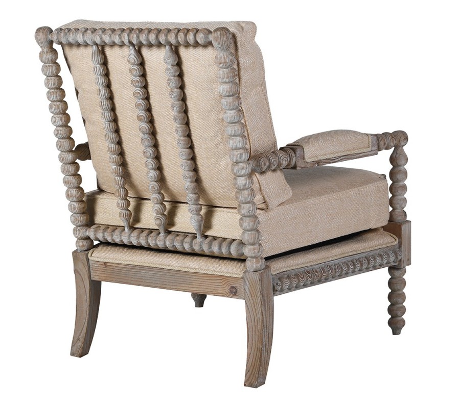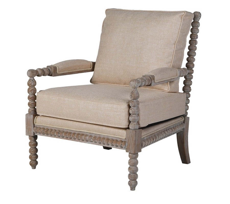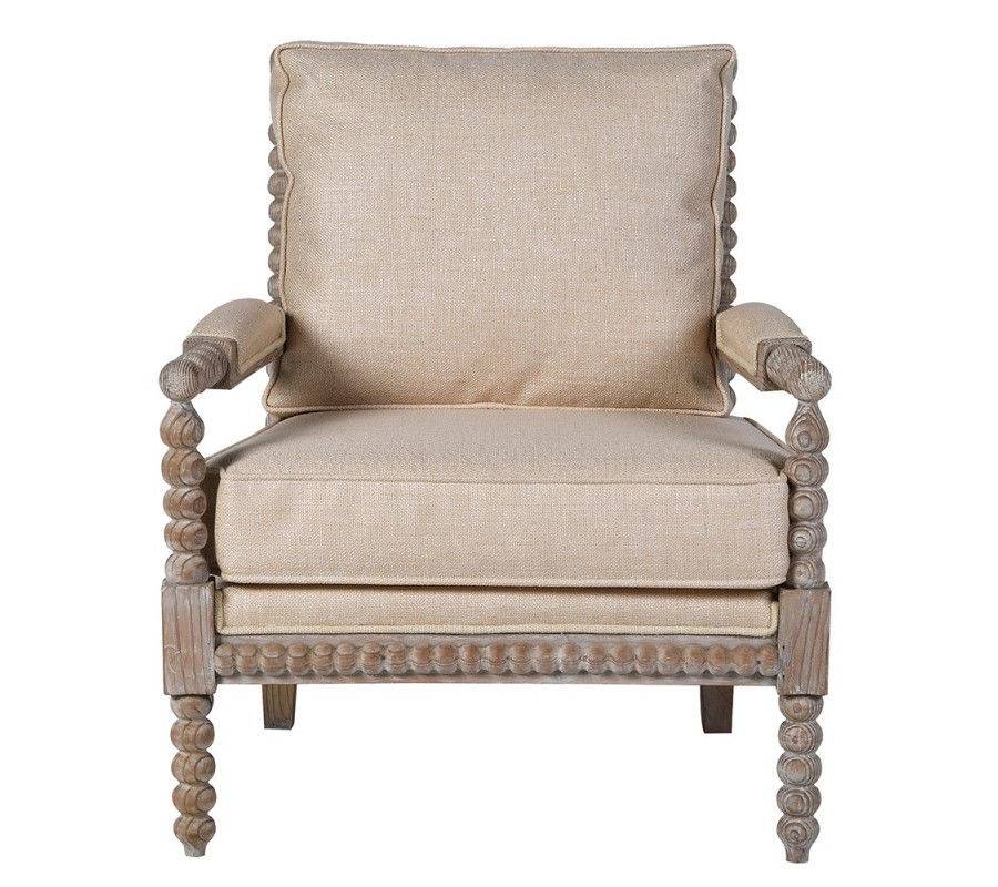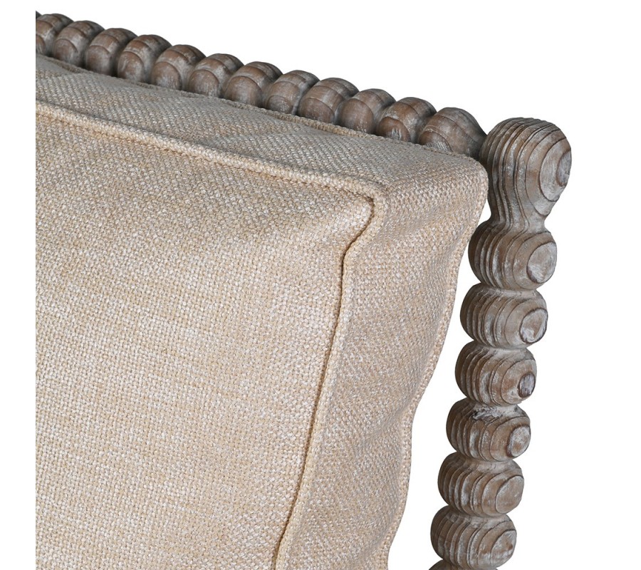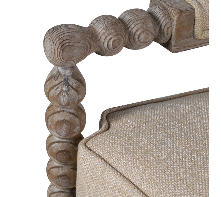 Luxusné vintage kreslo Boia s vyrezávaným hnedým dreveným rámom s guličkami a béžovým ľanovým čalúnením 92 cm