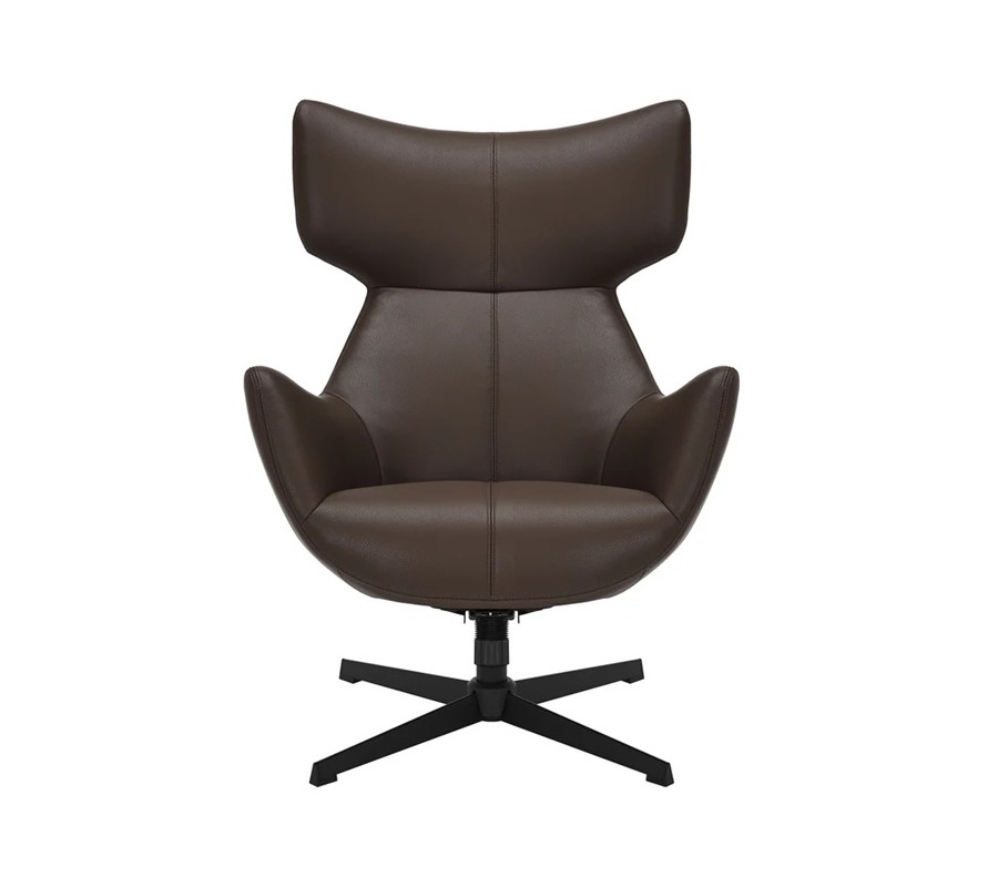 Kreslo má mohutnú sedaciu časť s vysokou chrbtovou opierkou, ktorú vo vrchnej časti dopĺňa rozšírená opierka na hlavu. Zošikmené línie pôsobia moderne a dynamicky, zatiaľ čo ergonomické zakrivenie sa prispôsobí telu. Sedadlo má v spodnej časti výrazne zaoblený tvar, ktorý v poloblúkovej línii prechádza do nižších opierok na ruky s rovnou vrchnou stranou.