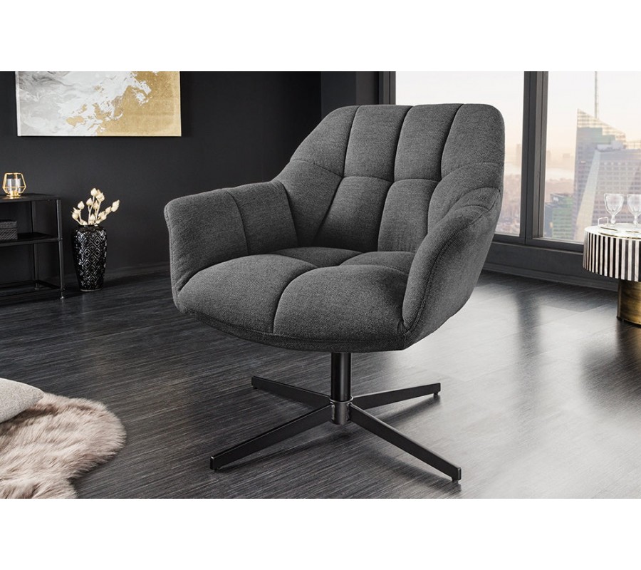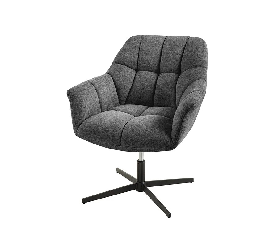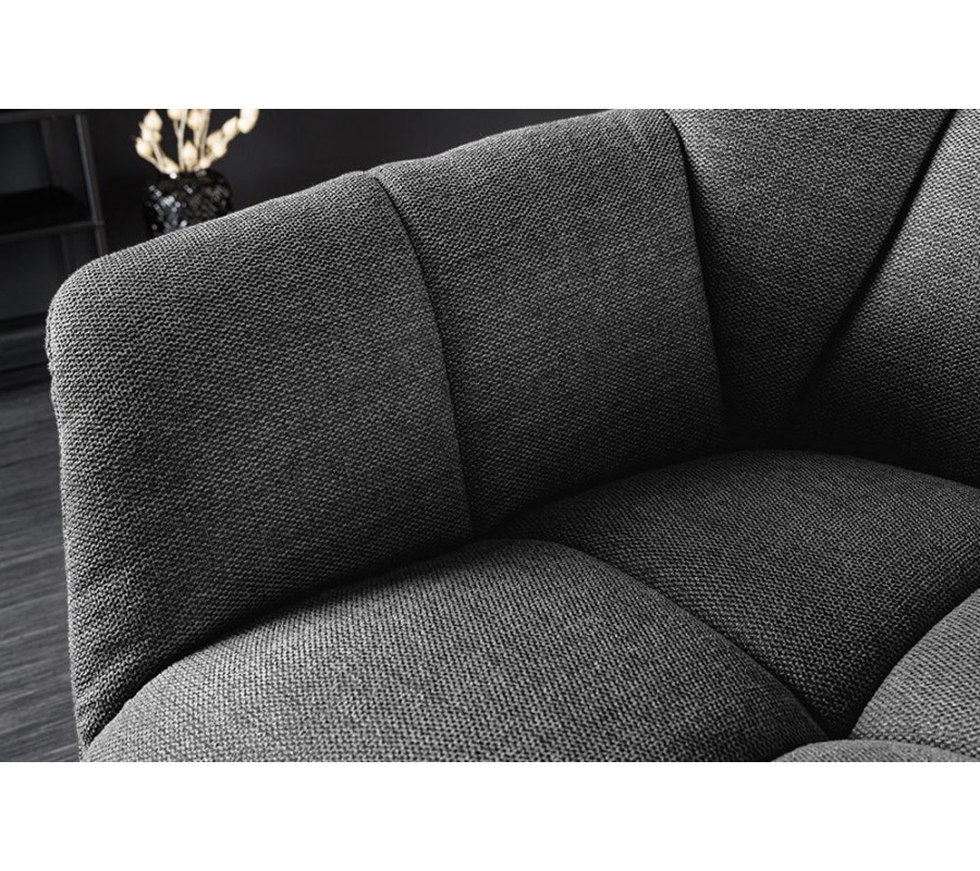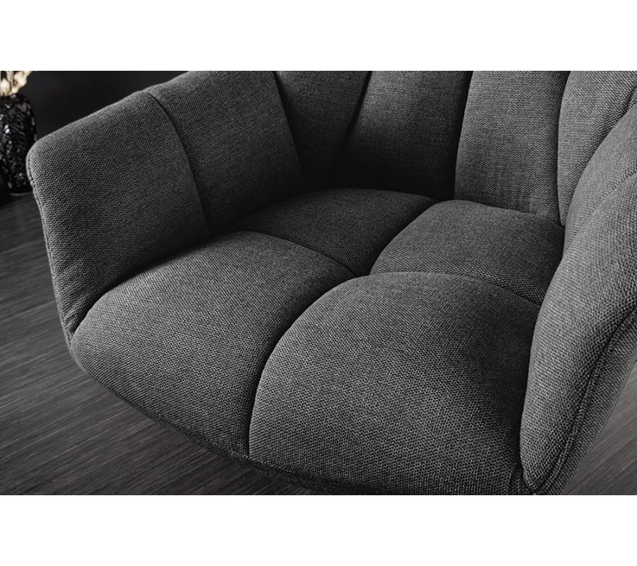 Kreslo má mohutnú sedaciu časť s obdĺžnikový sedadlom, ktoré je v zadnej časti mierne zúžené. Dopĺňa ho vysoká chrbtová opierka, plynule prechádzajúca do nižších bočných opierok. Bohaté penové čalúnenie zaručí maximálny komfort a prešívanie so vzorom štvorcov ešte zdôrazňuje jeho mäkký vizuál. Poťah je vyrobený z mikrovlákna s dizajnom hladko tkanej textílie. Je mimoriadne odolný a zároveň príjemný na dotyk. Jeho sivá farba pôsobí sofistikovaný dojmom.