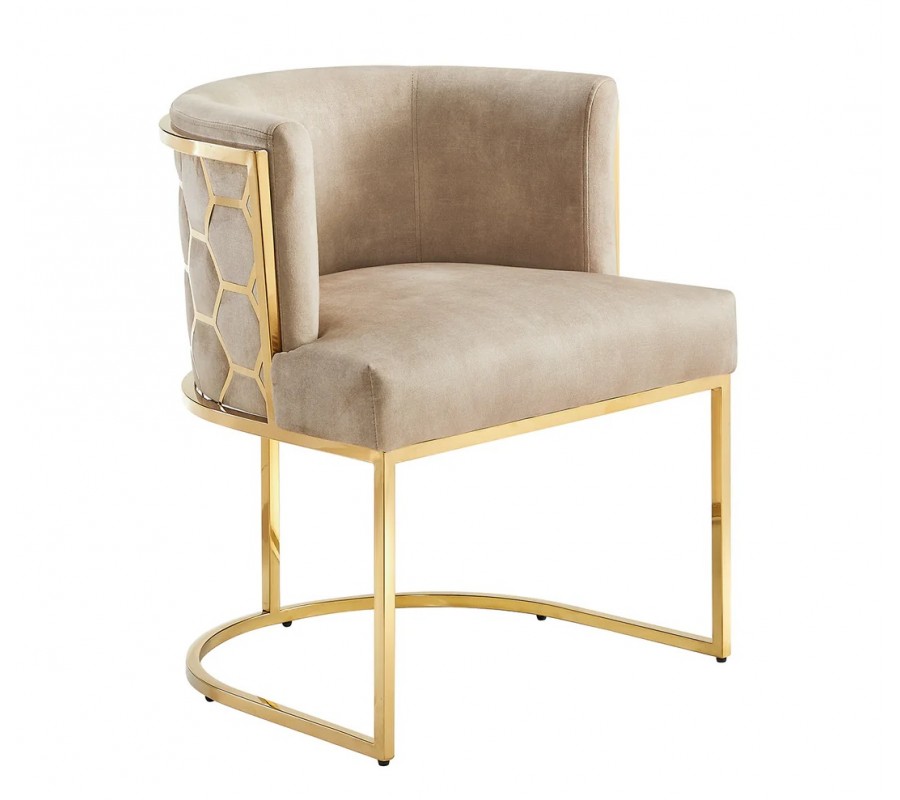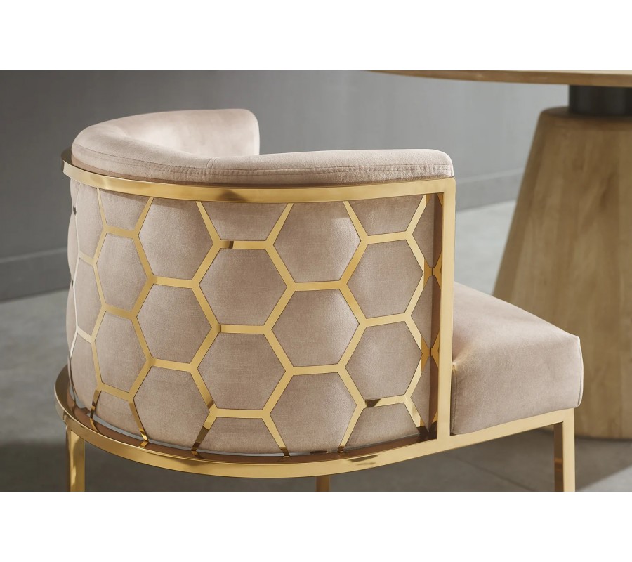 Art deco jedálenská stolička Leara s béžovým zamatovým poťahom a zlatou kovovou konštrukciou so vzorom medového plátu 75 cm