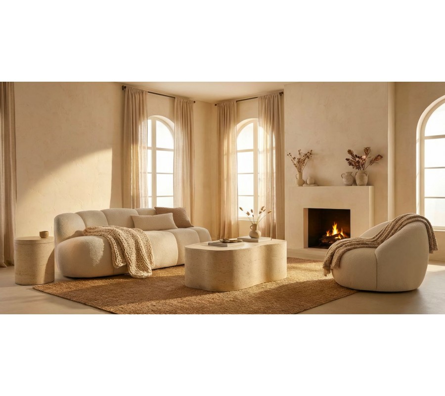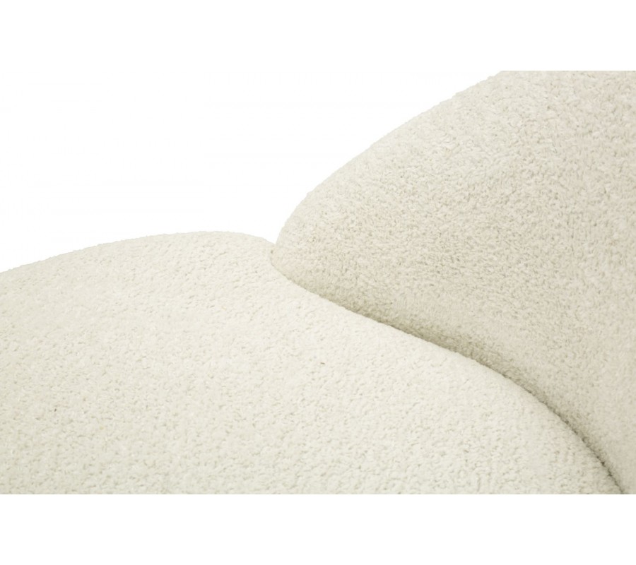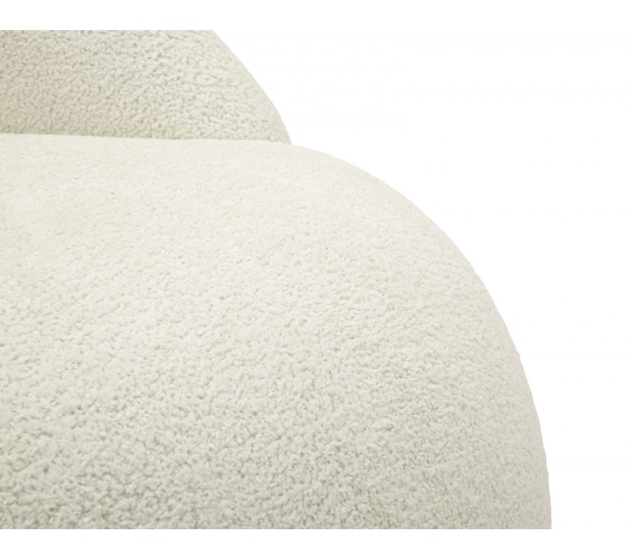 Kreslo má pevnú drevenú konštrukciu s penovou výplňou a poťahom z mikrovlákna, ktorý výborne odolá vplyvom každodenného používania. Má na dotyk príjemný plyšový finiš s kratším vlasom, vytvárajúci jemnú vizuálnu štruktúru. Prevedenie v bielej farbe je nadčasové a dodáva nábytku monolitický, až skulpturálny výraz.