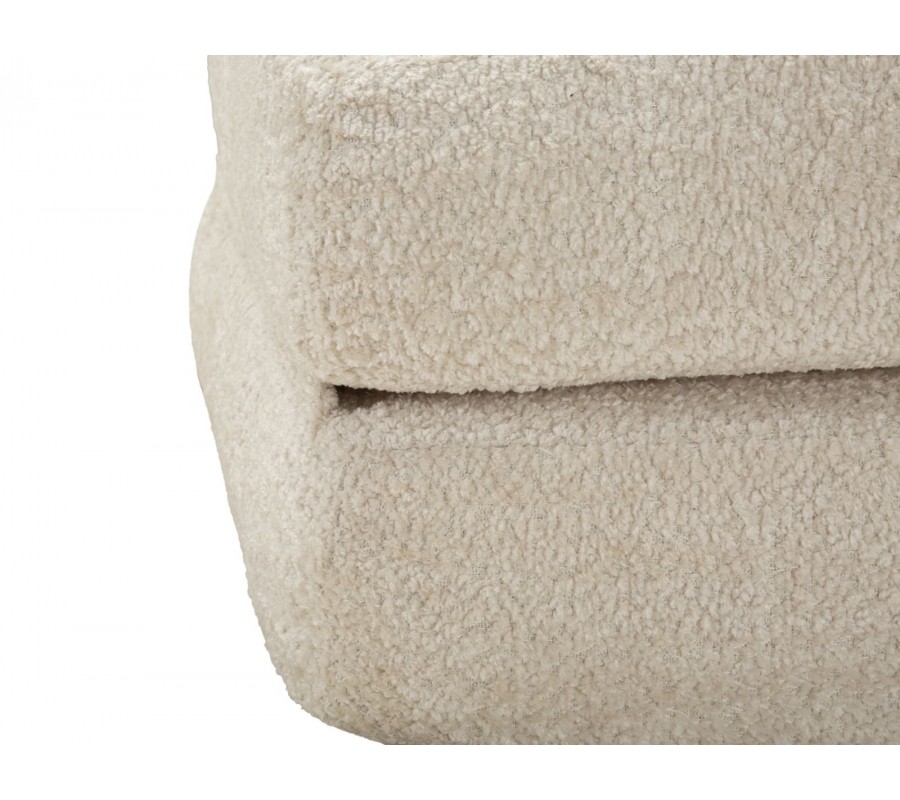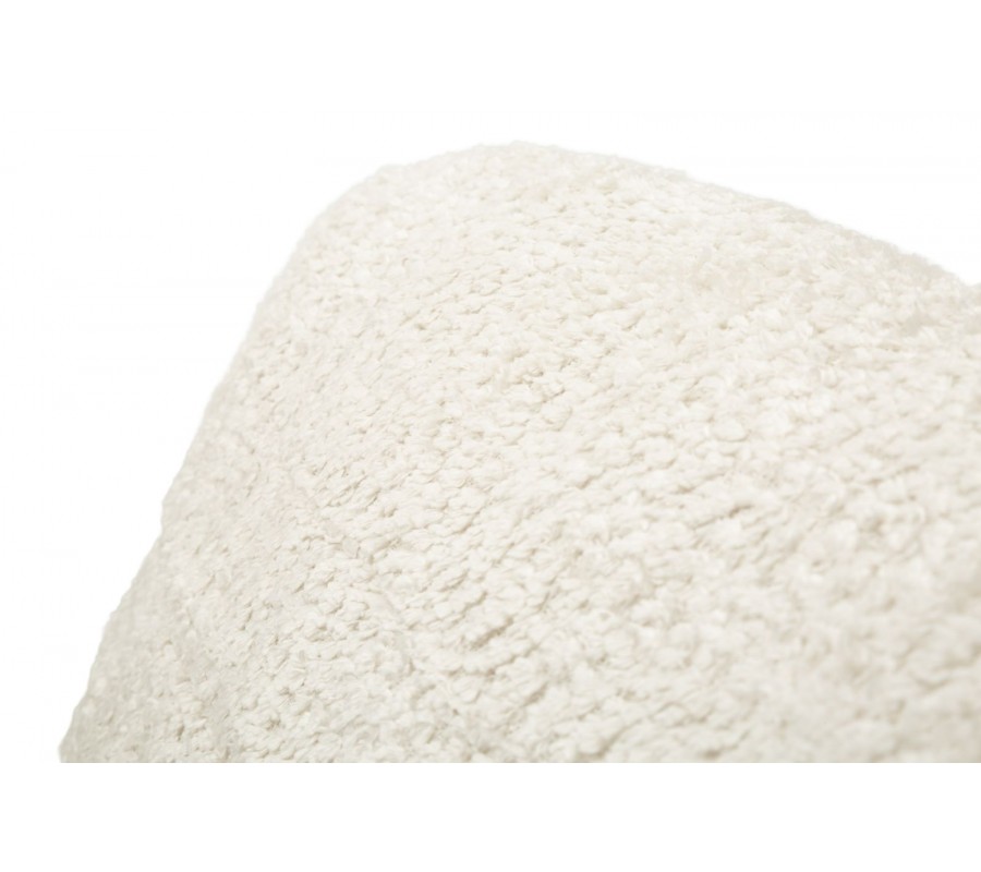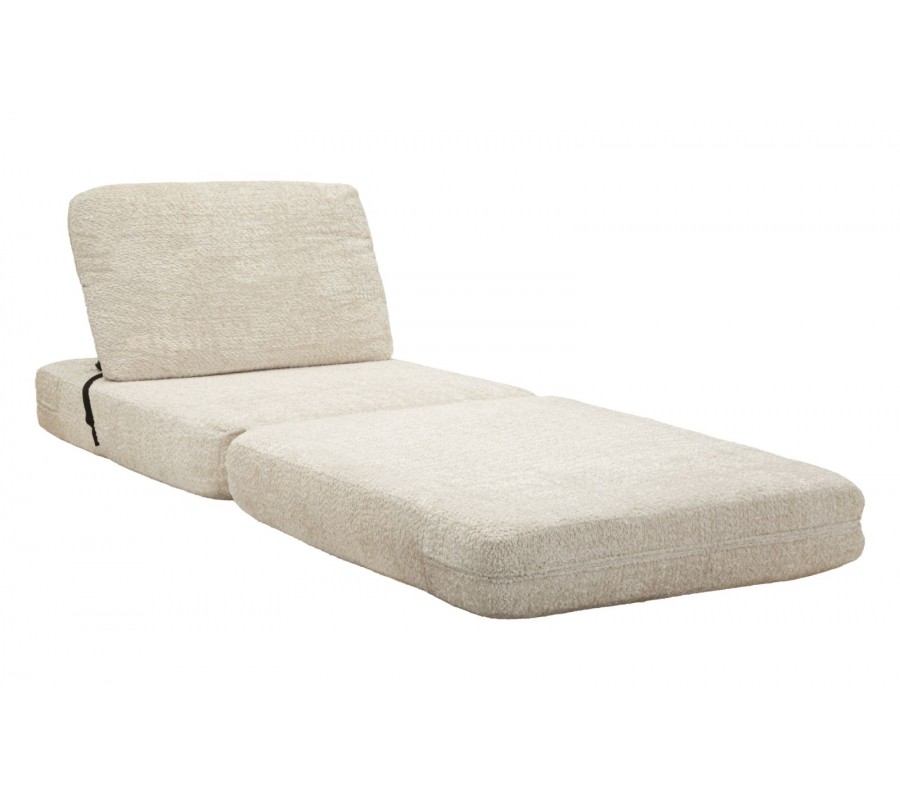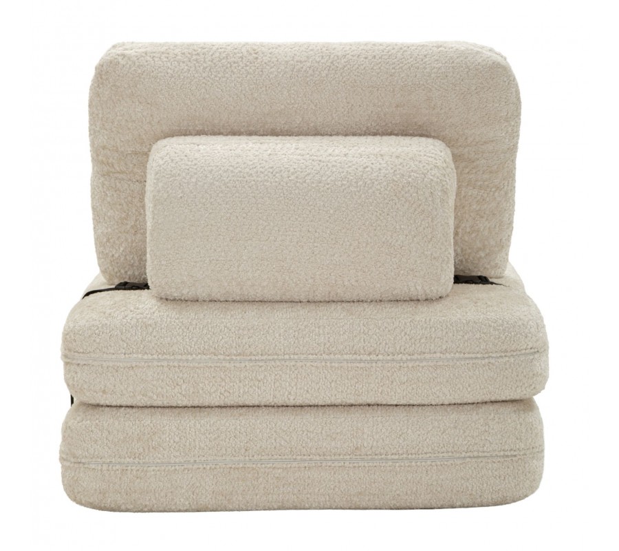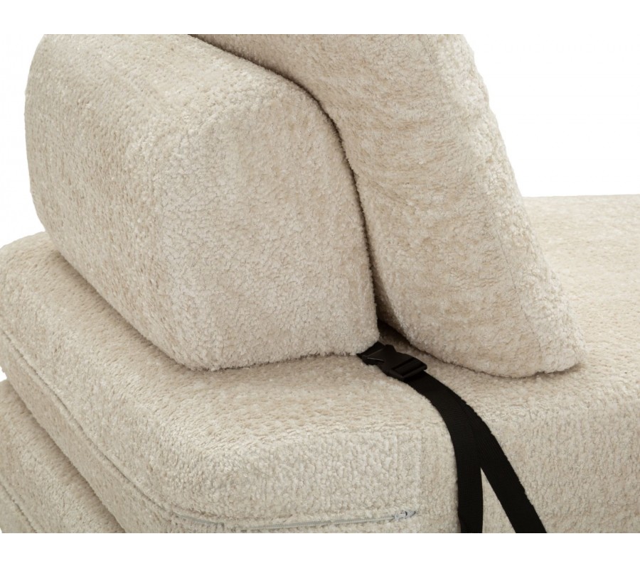 Moderné dizajnové rozkladacie kreslo Raffai v krémovej farbe zaujme svojím čistým obdĺžnikovým tvarom a mäkkým, objemným čalúnením s príjemnou textúrou. Kreslo pozostáva z dvoch podsedákov, pričom spodné sedadlo je možné jednoducho preklopiť dopredu a rozšíriť tak plochu na sedenie alebo ležanie. Obdĺžnikové operadlo je zozadu podopreté čalúnenou valcovou oporou, ktorá zvyšuje komfort aj stabilitu. Praktickým a zároveň vizuálnym detailom je čierna šnúra na zadnej strane, ktorá spevňuje obe sedacie časti a zabraňuje ich samovoľnému rozchádzaniu pri sedení, pričom vytvára jemný kontrast k svetlému poťahu.