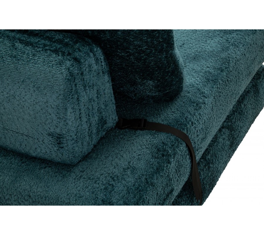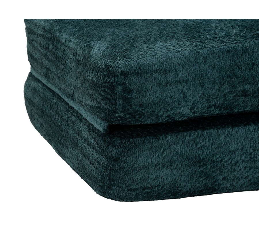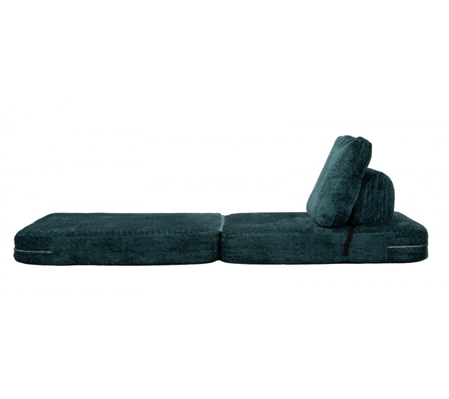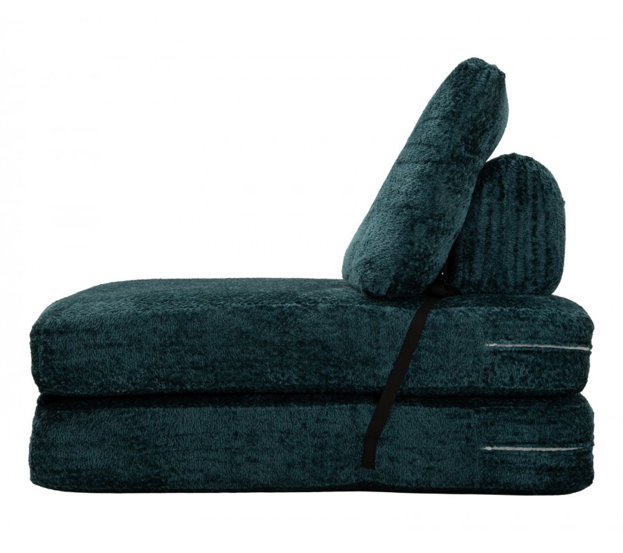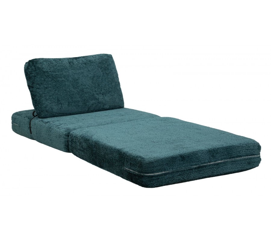 Moderné dizajnové rozkladacie kreslo v sýtom modrom odtieni zaujme svojím čistým obdĺžnikovým tvarom a mäkkým, plyšovým poťahom, ktorý pôsobí mimoriadne útulne a komfortne. Kreslo je tvorené dvomi sedacími časťami, pričom spodný podsedák je možné jednoducho preklopiť dopredu a zväčšiť tak sedaciu alebo relaxačnú plochu. Obdĺžnikové operadlo je zozadu podopreté čalúnenou valcovou oporou, ktorá zvyšuje pohodlie a stabilitu pri sedení. Obe sedacie časti sú na zadnej strane spevnené čiernou šnúrou, ktorá zabraňuje ich rozchádzaniu, zároveň však vytvára jemný grafický kontrast a dizajnový detail. Kreslo je bez bočných opierok, vďaka čomu pôsobí vzdušne, moderne a neuzatvára priestor.