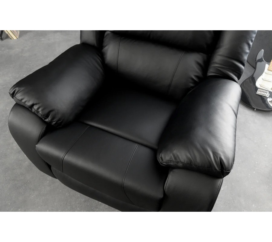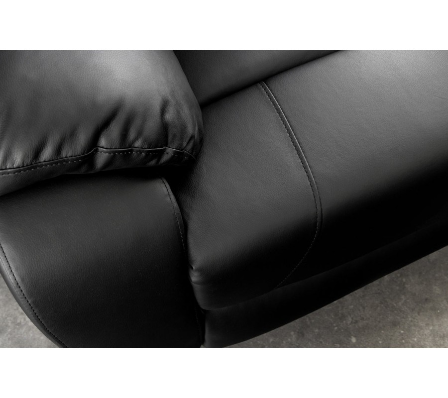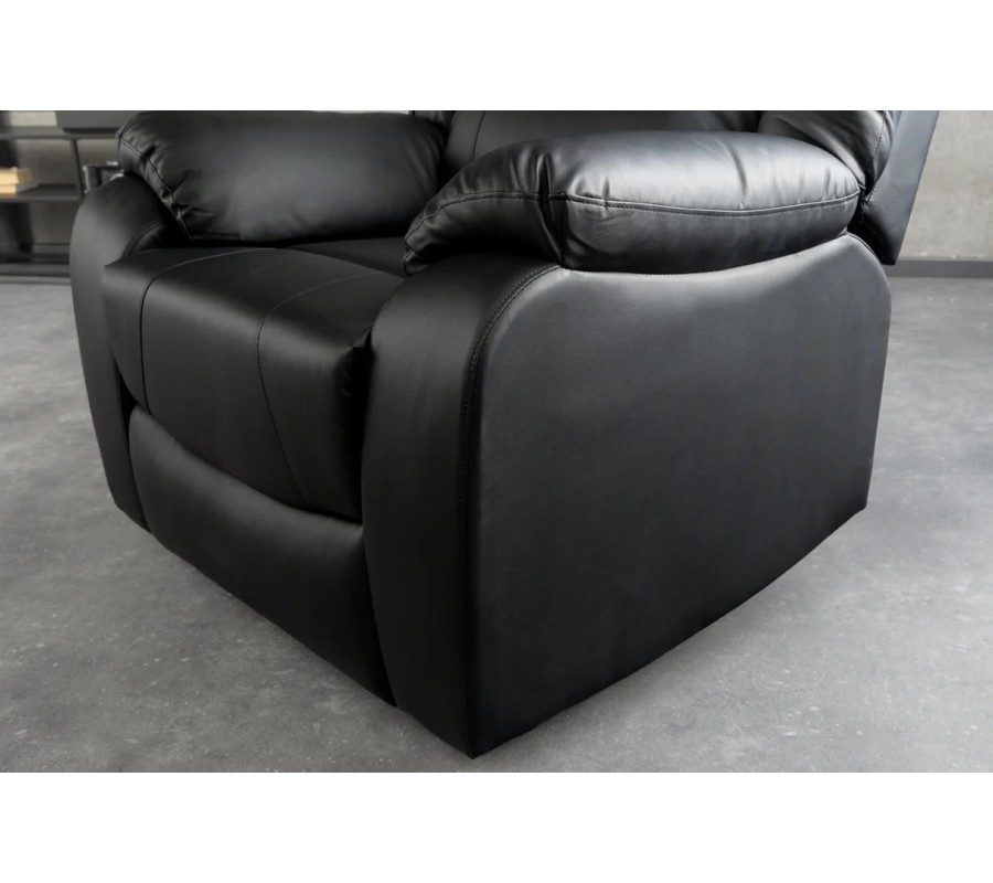 Kreslo je čalúnené poťahom z eko kože, ktorý má hladký kožený vzhľad, je príjemný na dotyk a nenáročný na údržbu. Čierna farba dodáva kreslu sofistikovaný, moderný charakter a robí z neho výrazný prvok interiéru. Mäkké čalúnenie sedadla, operadla aj opierok rúk poskytuje komfortnú oporu pri dlhšom sedení, sledovaní filmov alebo oddychu.