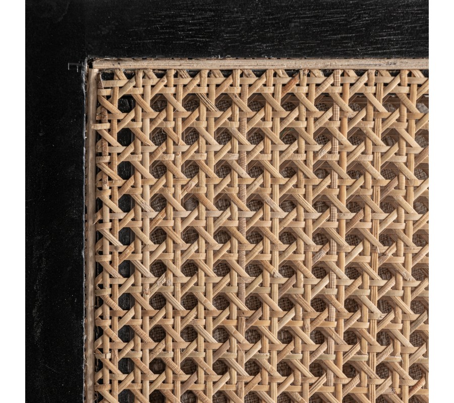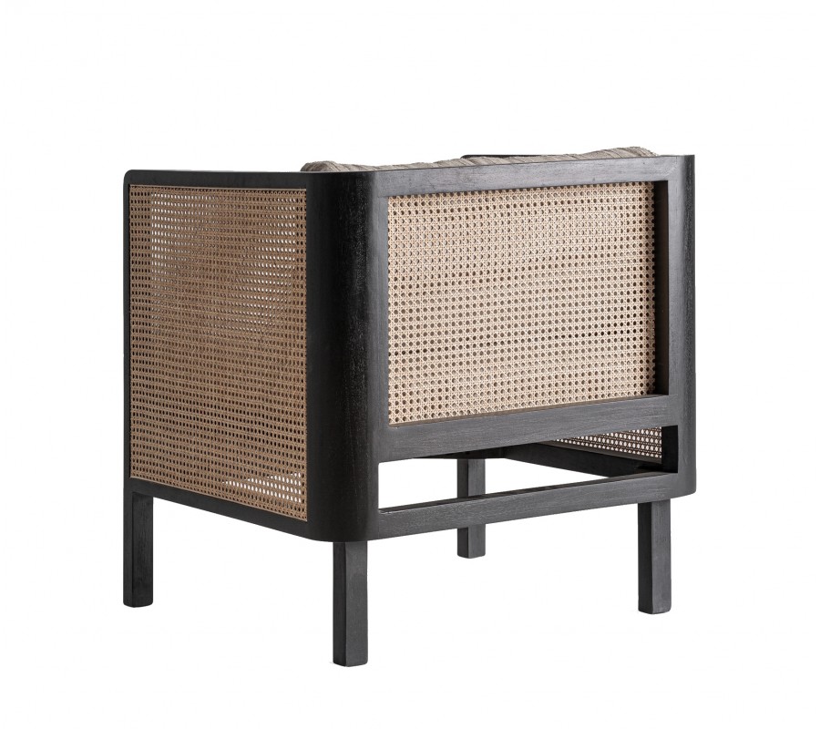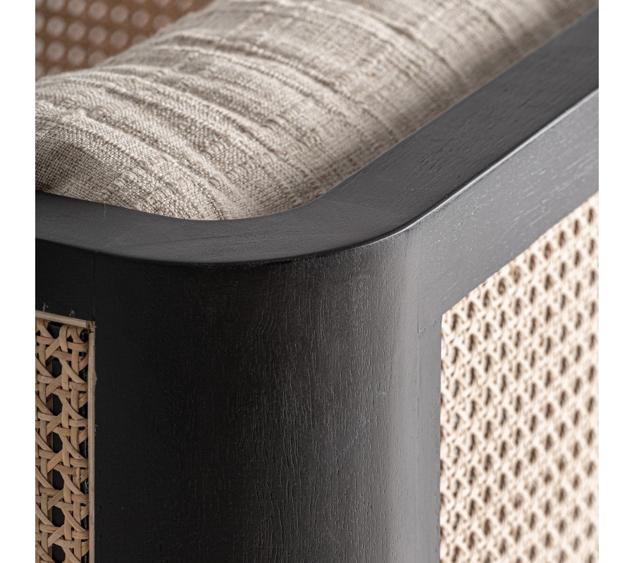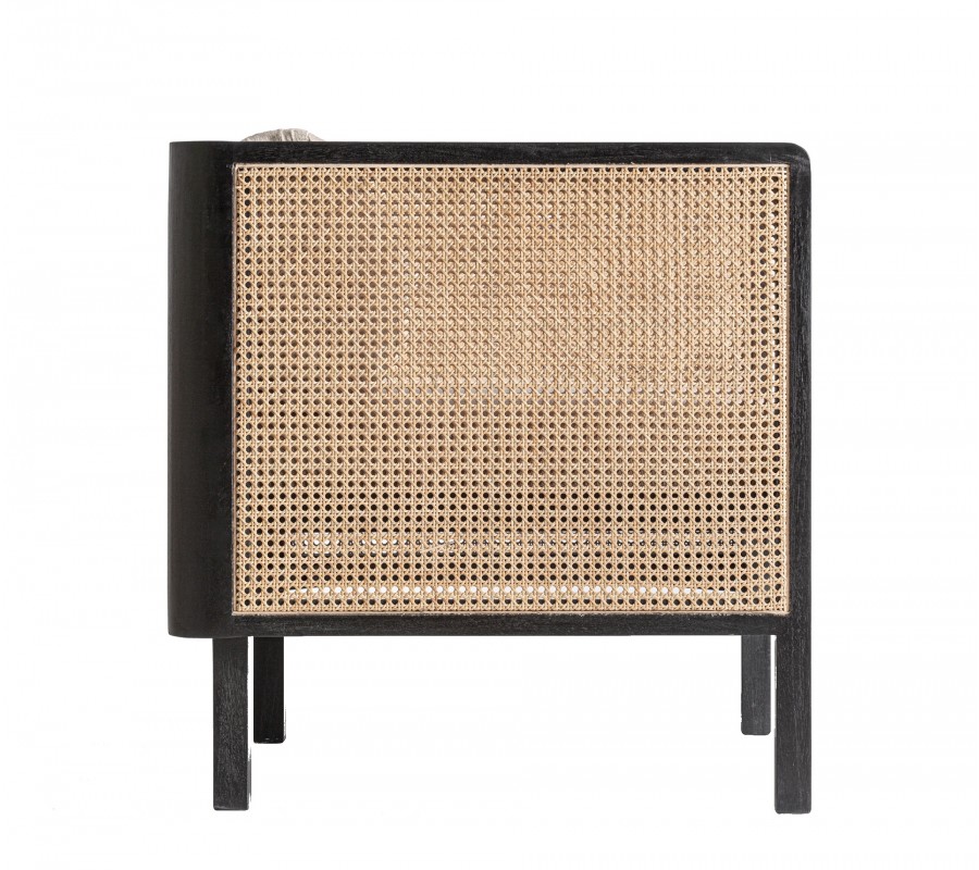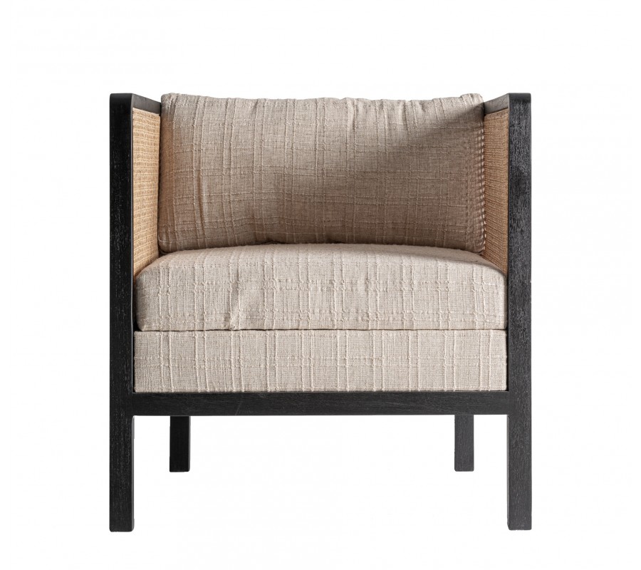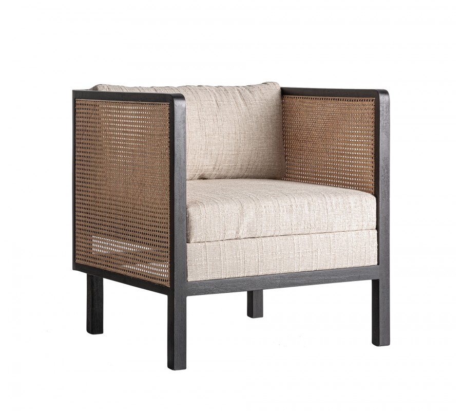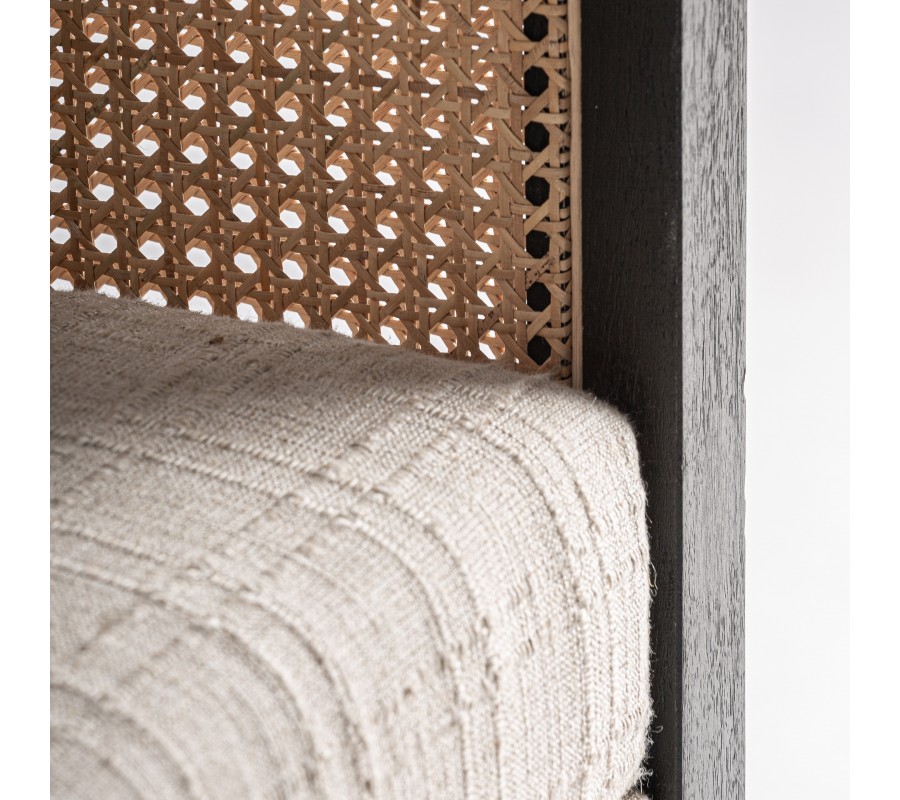 Bočné panely a zadná časť sú vyplnené ratanovým výpletom v klasickom viedenskom vzore, ktorý do priestoru prináša vzdušnosť a prirodzenú textúru. Charakteristická hexagonálna štruktúra ratanu v kombinácii s tmavým dreveným rámom vytvára elegantnú hru svetla a tieňa, zatiaľ čo pohodlná sedacia poduška a oporný vankúš v krémovej látke kreslo vizuálne zjemňujú. Čisté línie, vyvážené proporcie a štvorcová silueta odkazujú na estetiku art deco v modernom prevedení.